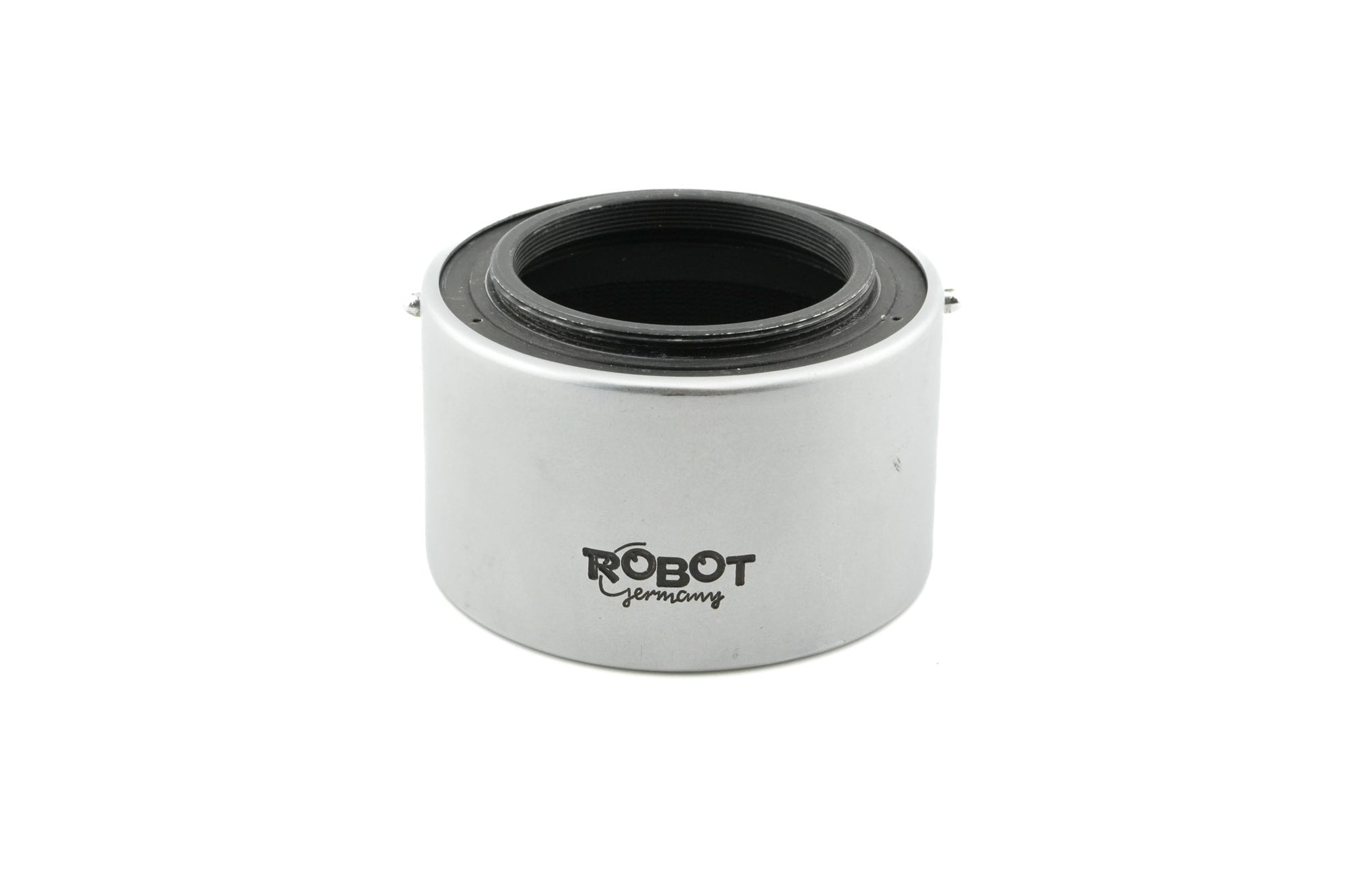 Metal lens hood for Robot cameras, or lenses with 37.5mm filter threads. Silver metal construction, with black internals to prevent reflection. Base (part with filter threads) detaches from main hood, assumedly so other length hoods or accessories can be affixed.