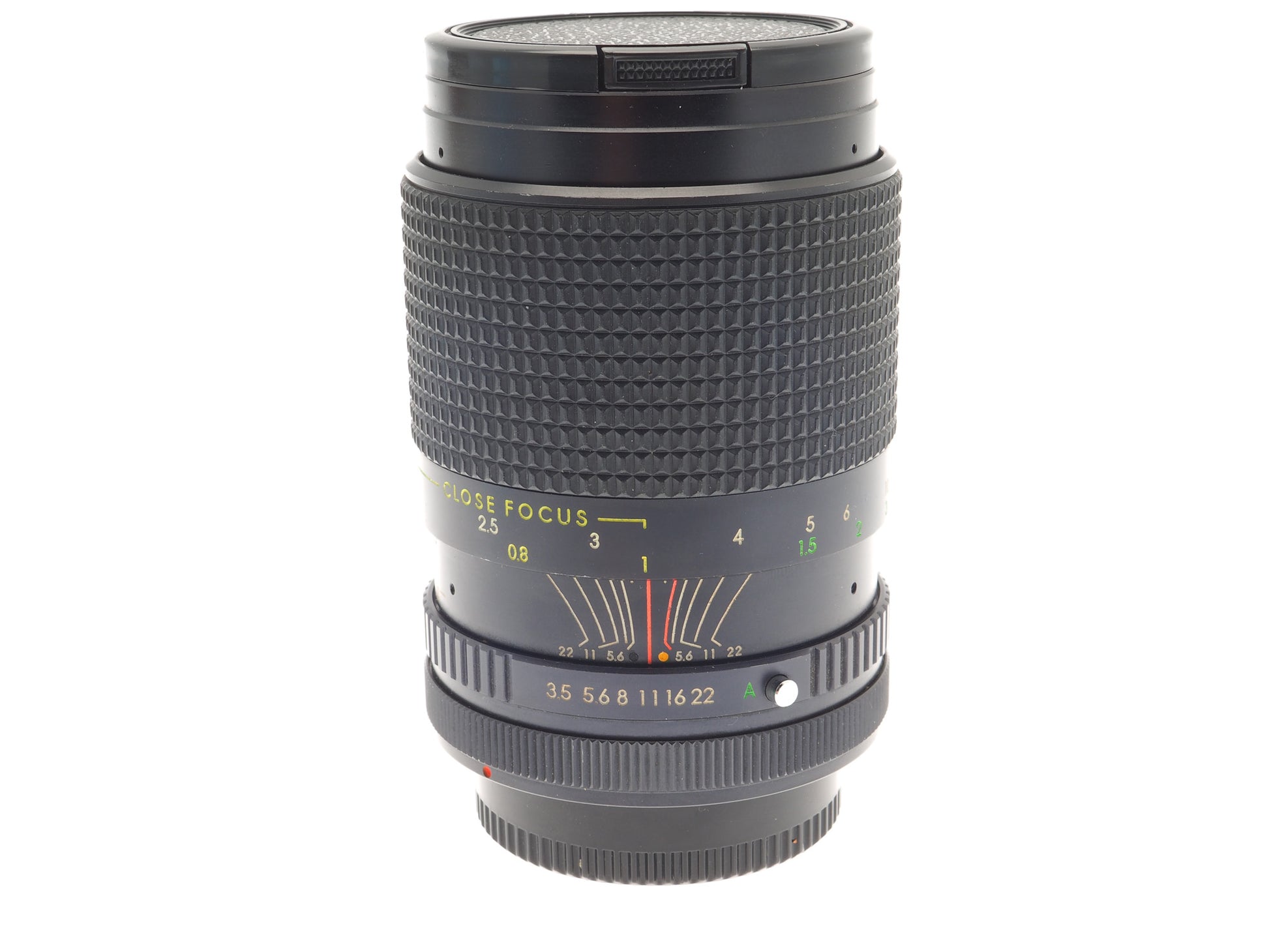 Manual focus standard zoom made for Canon FD mount 35mm SLRs by Rokinon. Uses a push/pull design. Metal body available in black.