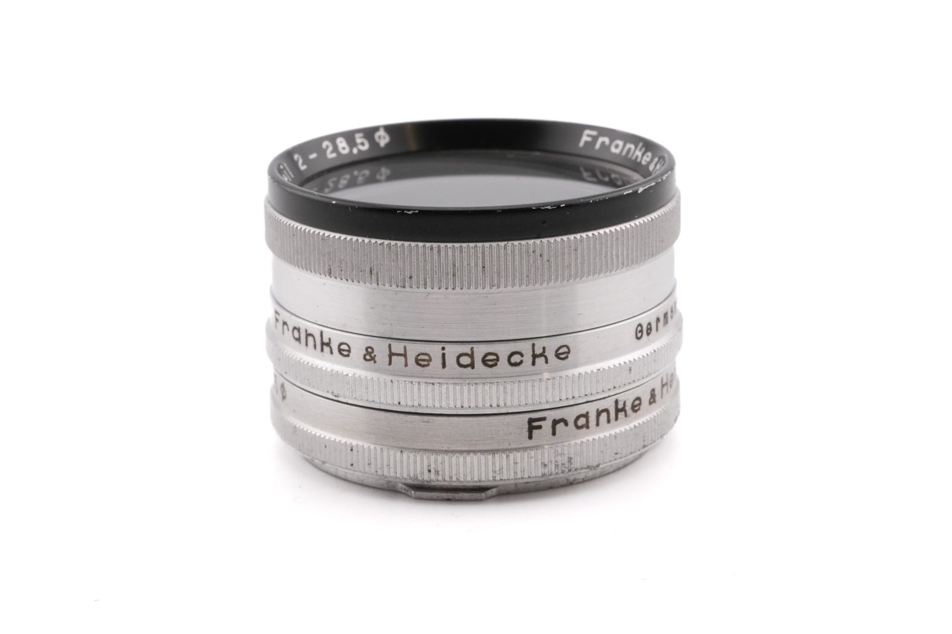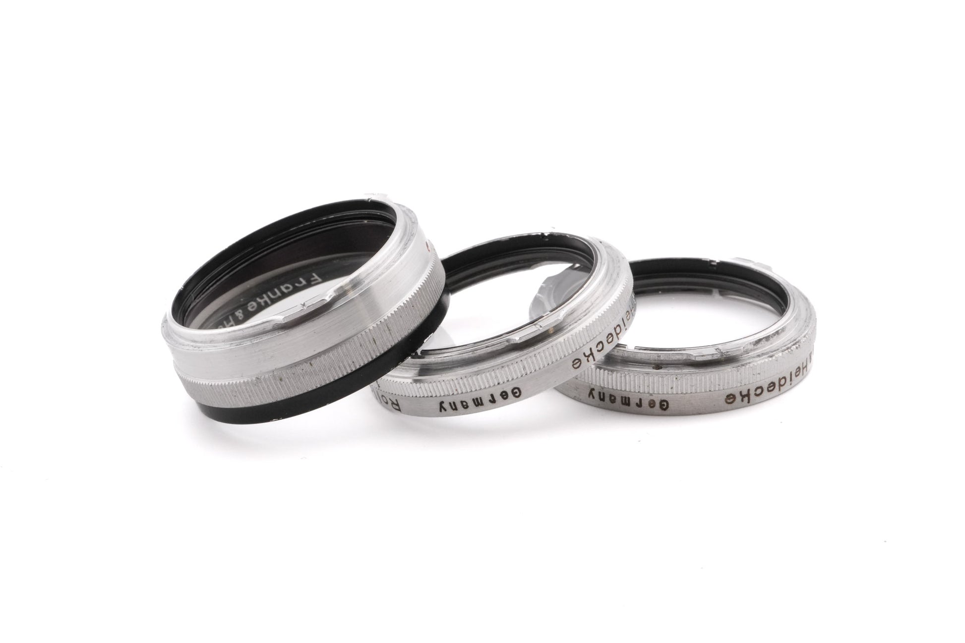 Close-up filter set made for TLRs by Rollei. The older version consists of three pieces and the newer version only has two. Both work identically and allow for focusing up to 31cm. Metal body available in silver.