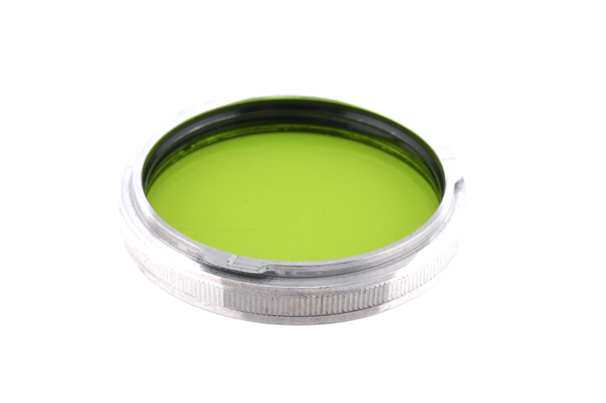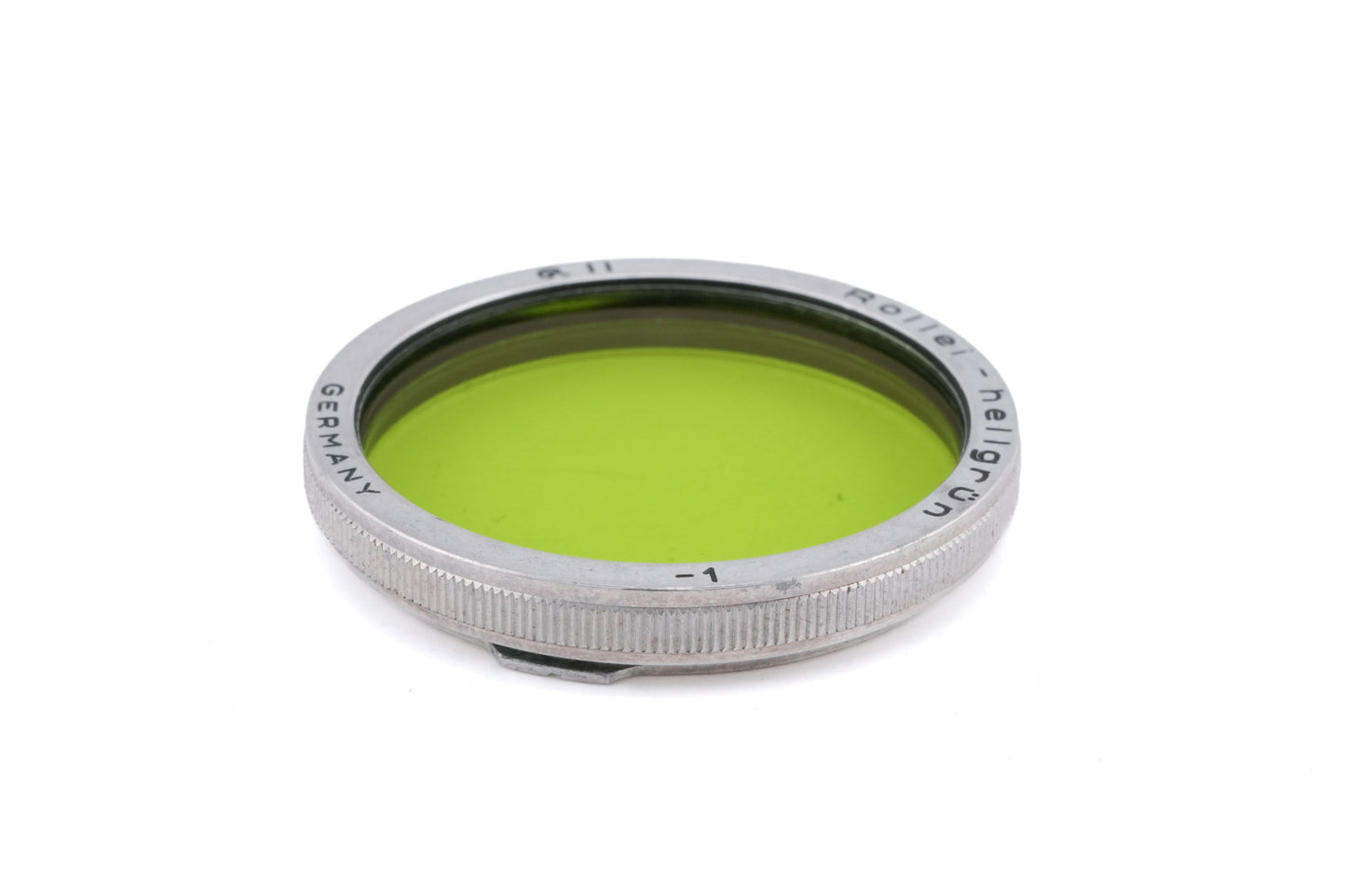 Light green filter for Rollei TLRs using Bay II accessory bayonets. Silver metal construction, with knurled sides.
