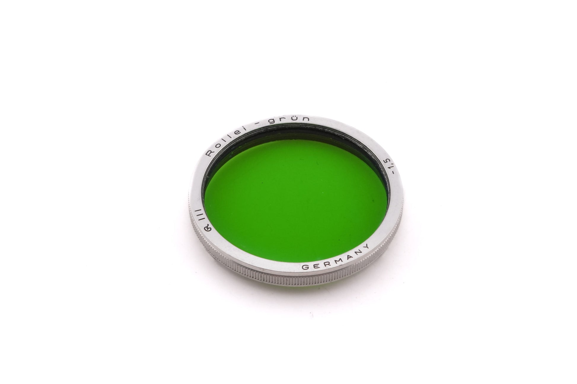 Green filter made by Rollei for TLRs with Bay 3 accessory bayonets. Lightens dark greens making the image look more natural. Darkens the sky and red roofs. Also functions as a UV filter. Chrome metal body.
