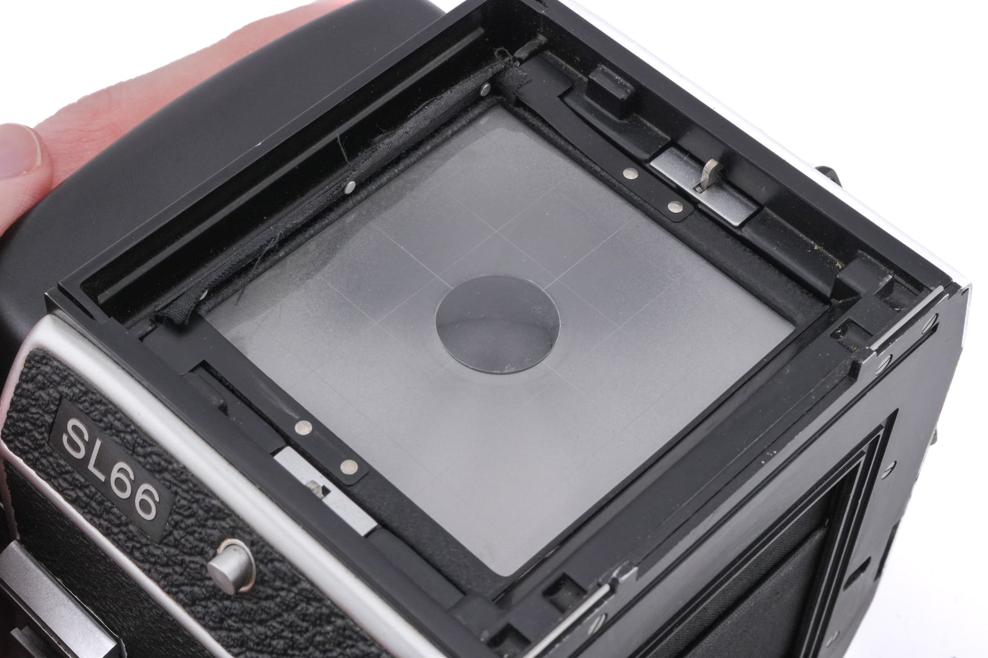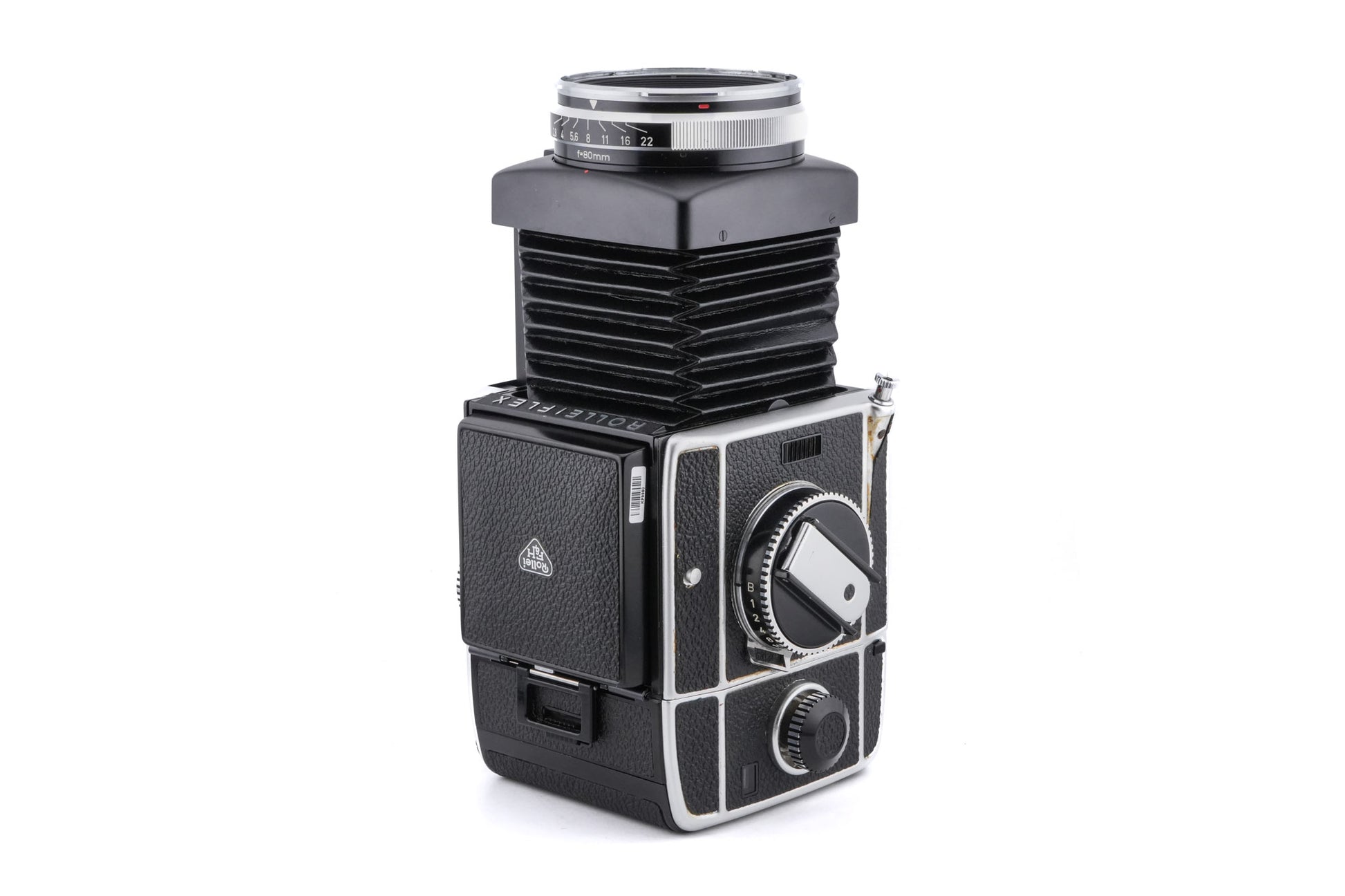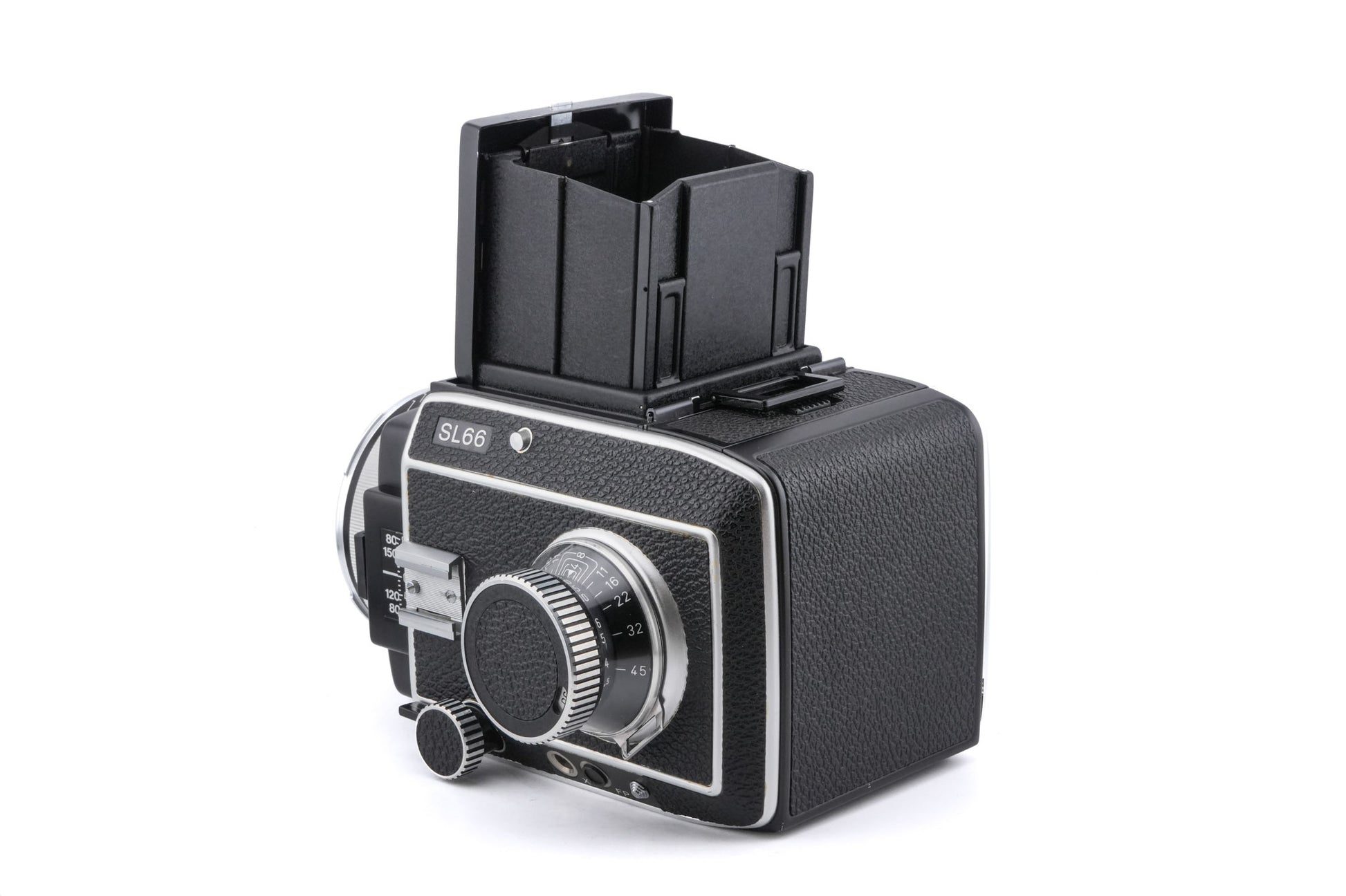 Manual focus 120 medium format modular SLR camera introduced by Rollei in 1966. It has interchangeable film magazines (6x6 & 6x4.5), focusing screens, viewfinders, and lenes. It has 50mm extending bellows with 8° tilt movements and a double bayonet mount which enables reverse-mounting most SL66-system lenses without any adapters.