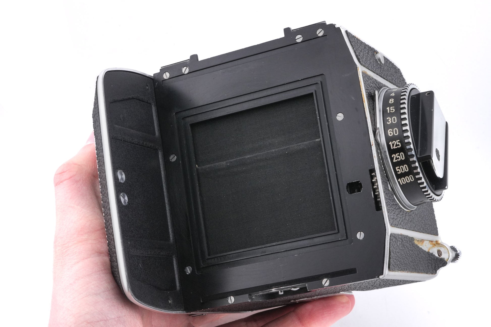 6x6 format film back for Rolleiflex SL66 camera. Metal body available in black/silver.