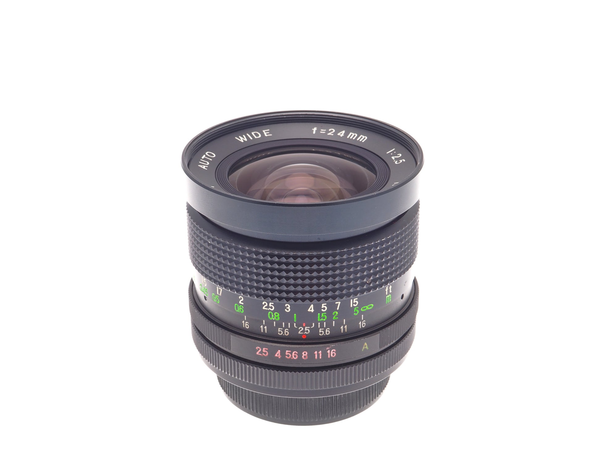 Manual focus wide-angle prime lens made for Canon MD mount SLR cameras by Samigon. Metal body available in black.