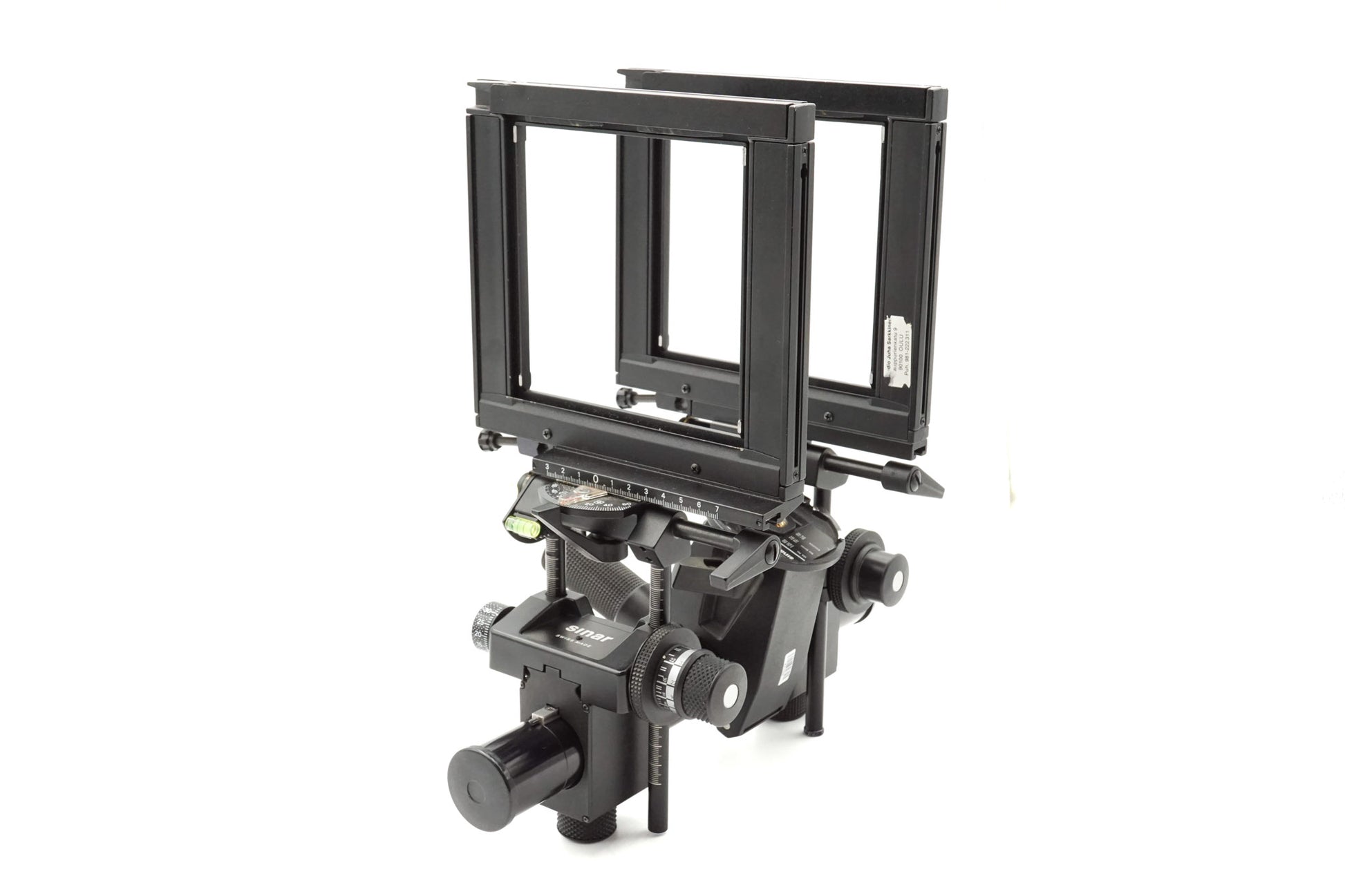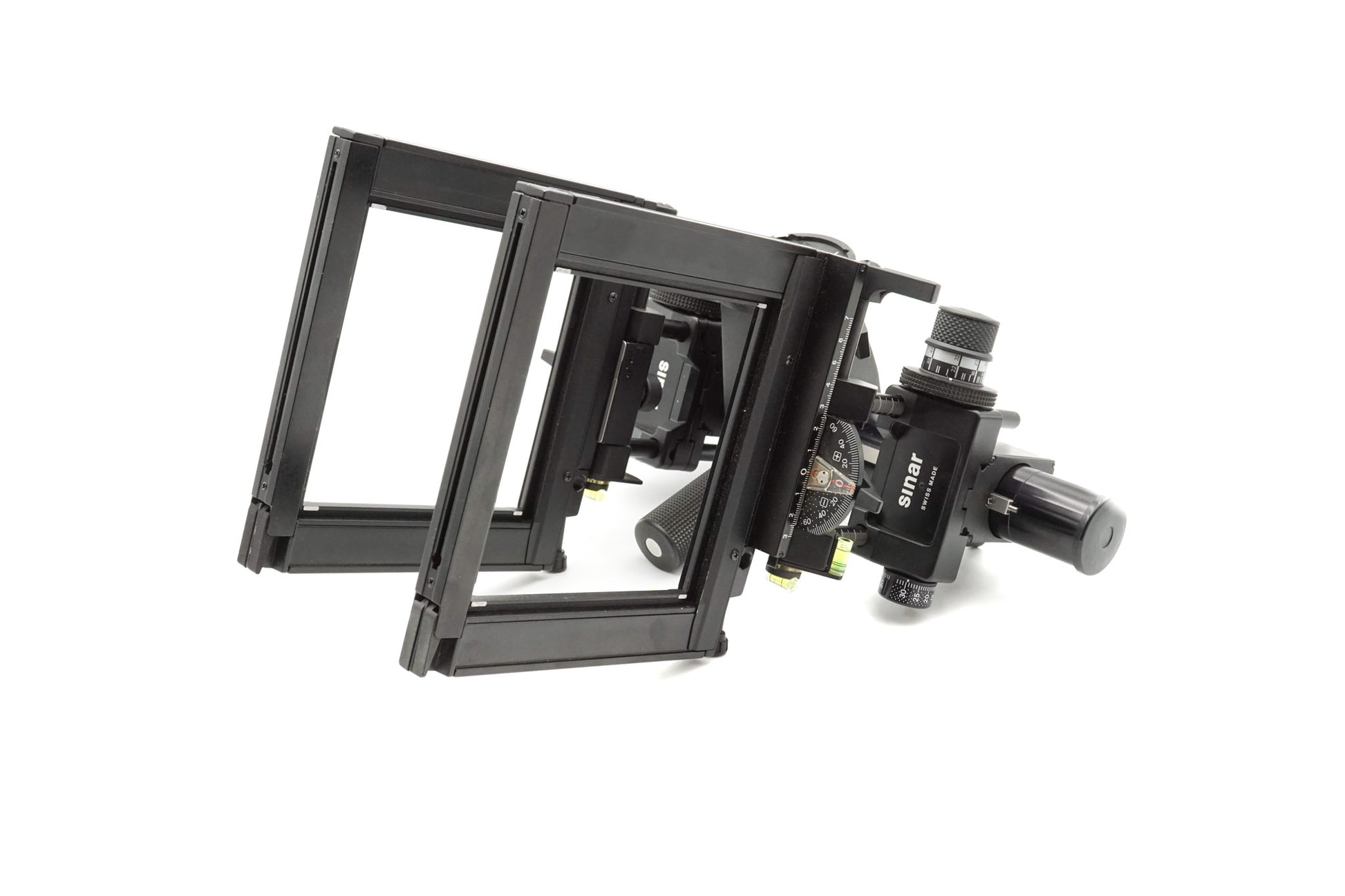 Large format 4x5 monorail camera made by Sinar. Metal body available in black.
