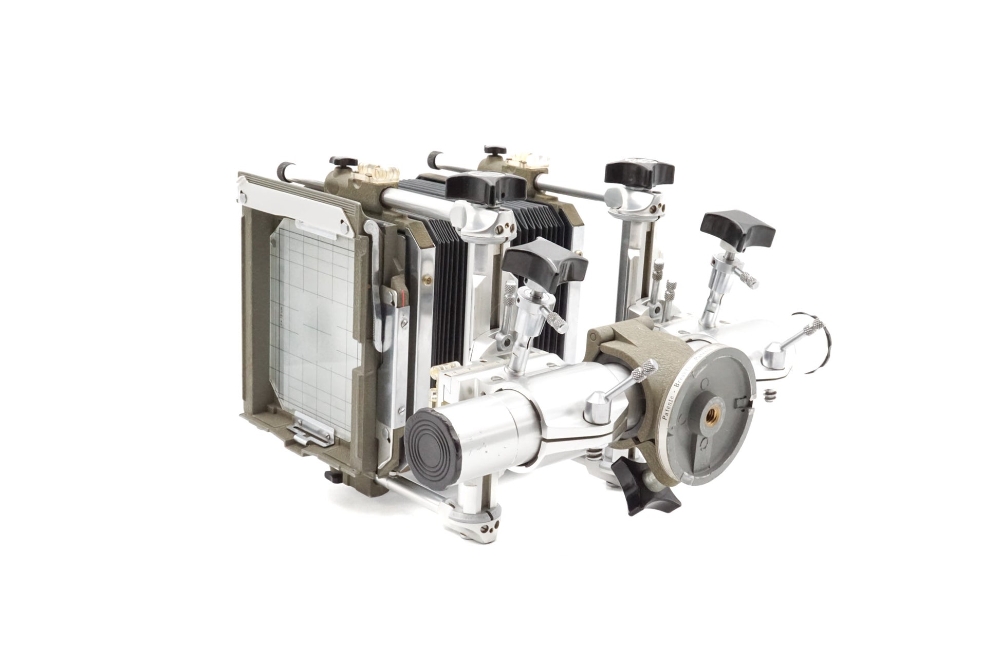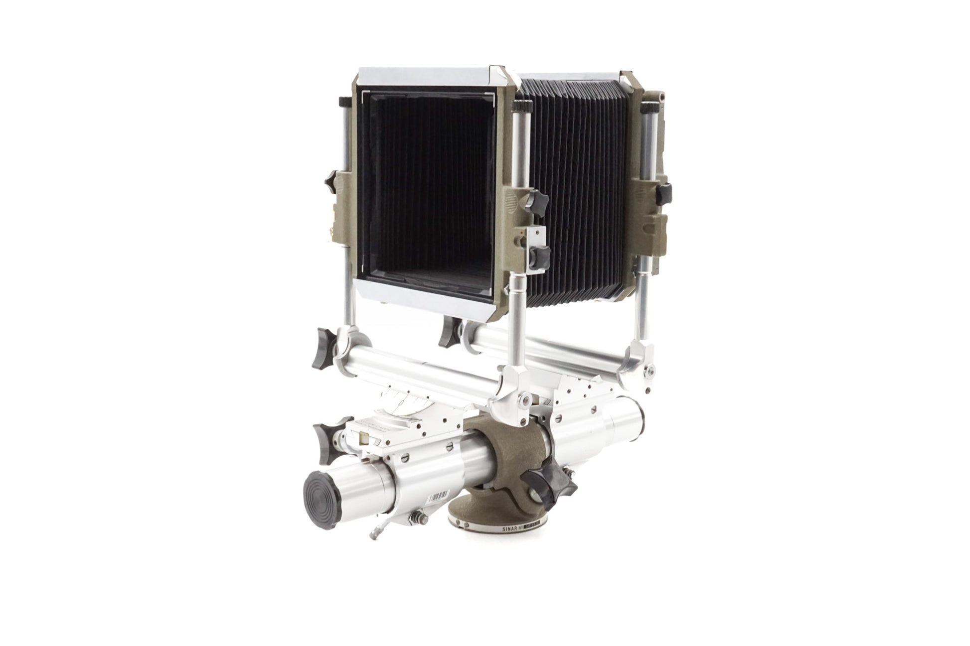 Monorail large format 4x5" camera made by Sinar introduced in 1963. It is convertible to 4x5, 5x7, and to 8x10 format. Metal construction available in gray/silver finish.