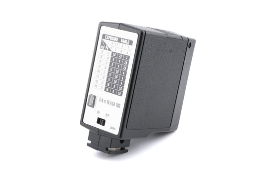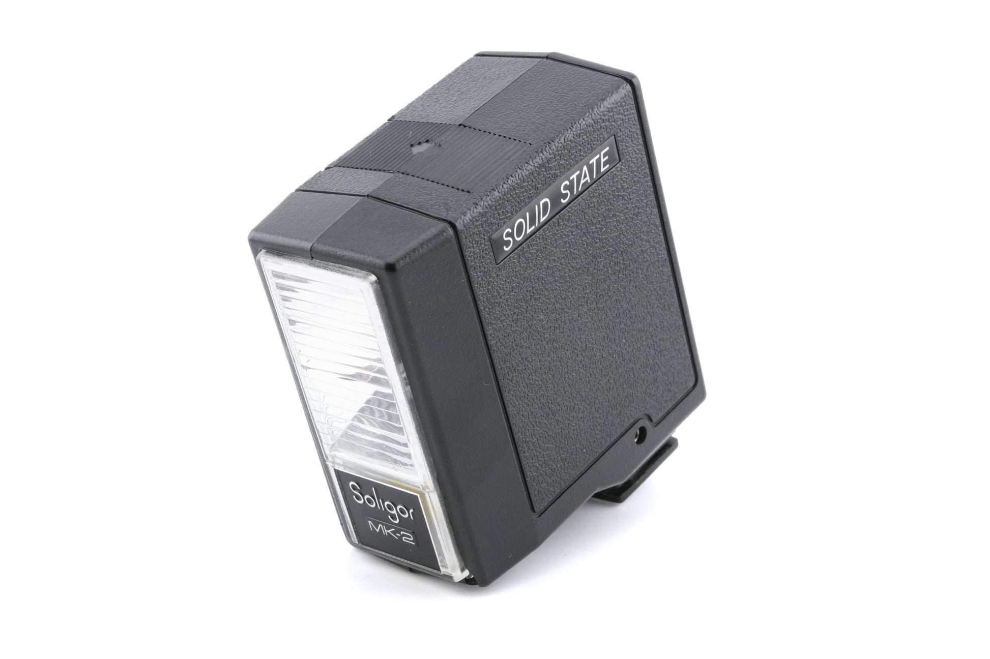 Flash made by Soligor for all cameras with a hot shoe or PC sync port. Has a single flash contact for manual flash control. Has 3 strengths, an attachable diffuser, and a 90º tilting head. Black plastic body.