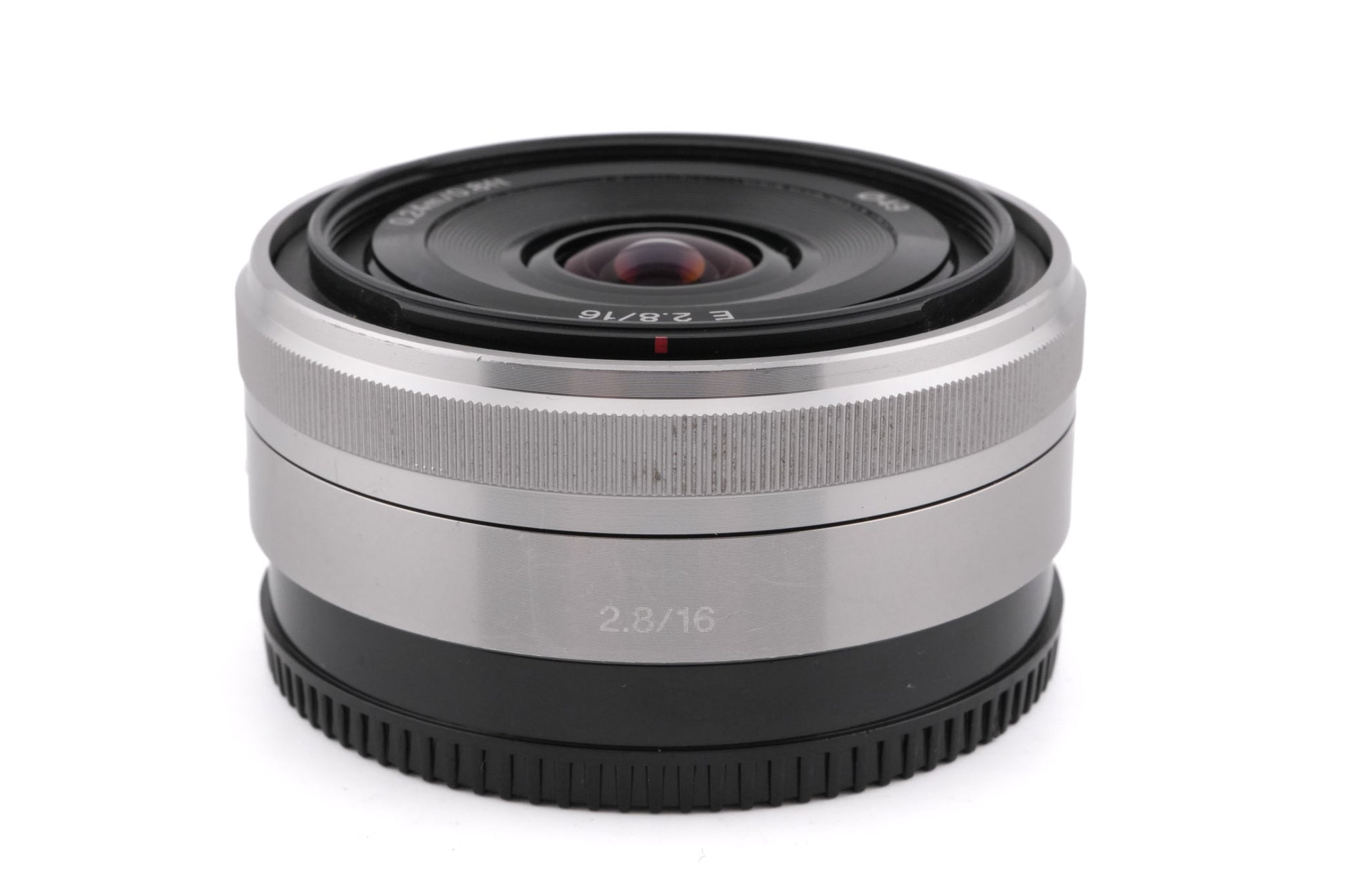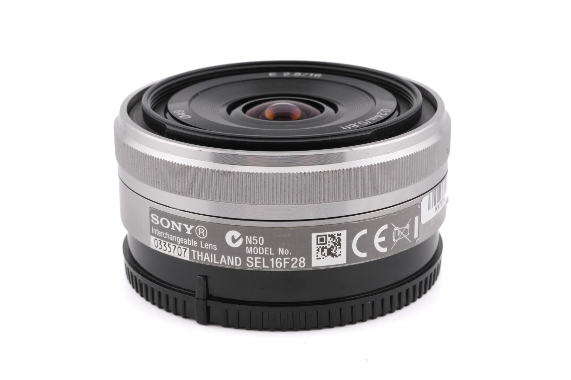 Autofocus wide-angle lens made for E-mount mirrorless digital cameras by Sony. The product code is SEL16F28. Plastic body available in silver.