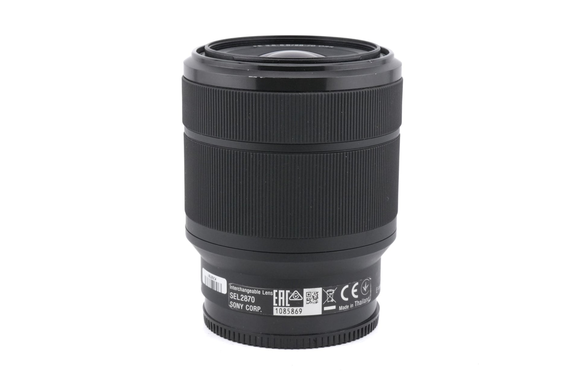 Autofocus standard zoom lens made for FE-mount digital mirrorless cameras introduced by Sony. It has built-in image stabilization (OSS) and is weather-resistant. The product code is SEL2870. Plastic body available in black.