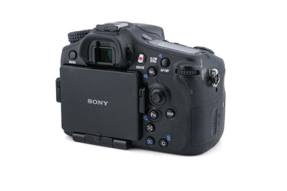 Autofocus A-mount digital SLT camera released by Sony. It has weather-sealing and a semi-translucent pellicle mirror instead of the moving mirror found in most SLRs. Magnesium alloy body available in black.