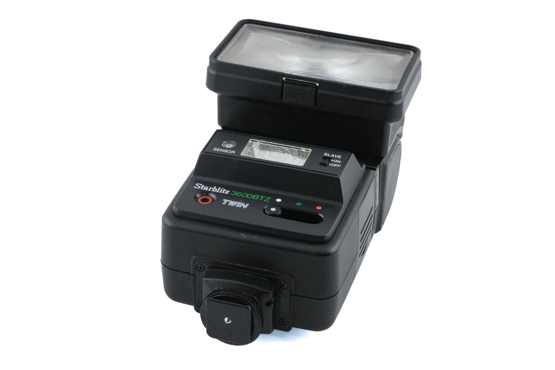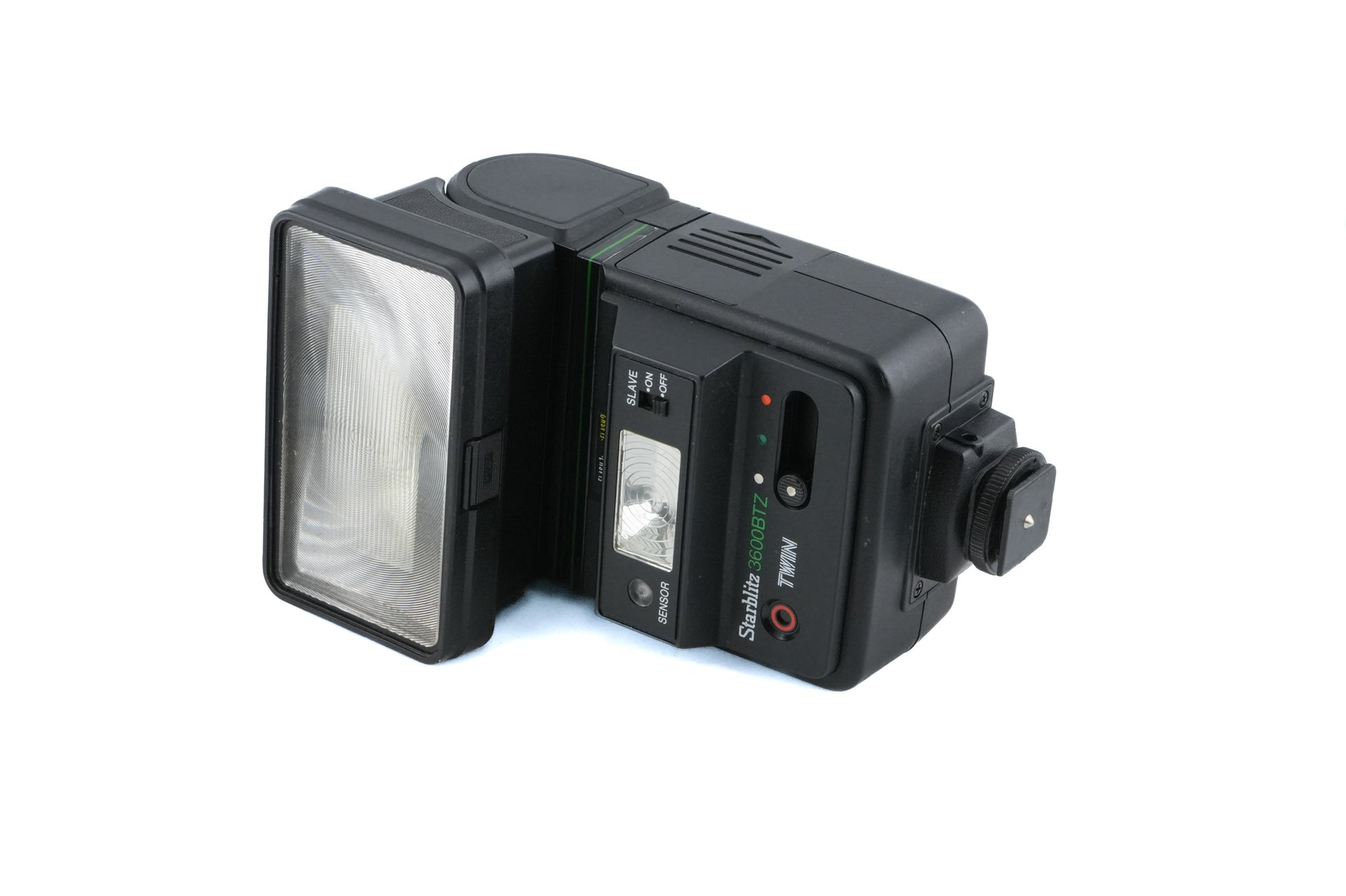 Automatic twin flash with slave function made by Starblitz. It has a single-pin shoe contact for flash trigger only. Plastic construction in black finish.