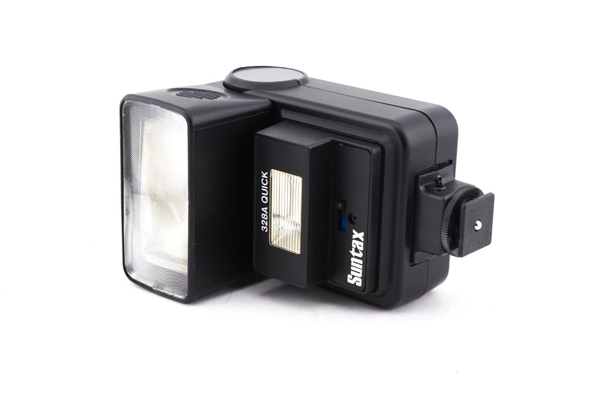 Flash made by Suntrax. Has a single flash contact for manual control. Tilts 90º. Plastic body available in black.