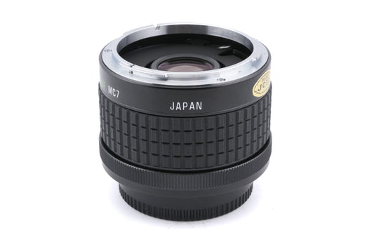 Teleconver made for FD-mount 35mm SLR cameras introduced by Tamron. It doubles the focal length at the cost of some light transmission. Metal body available in black.
