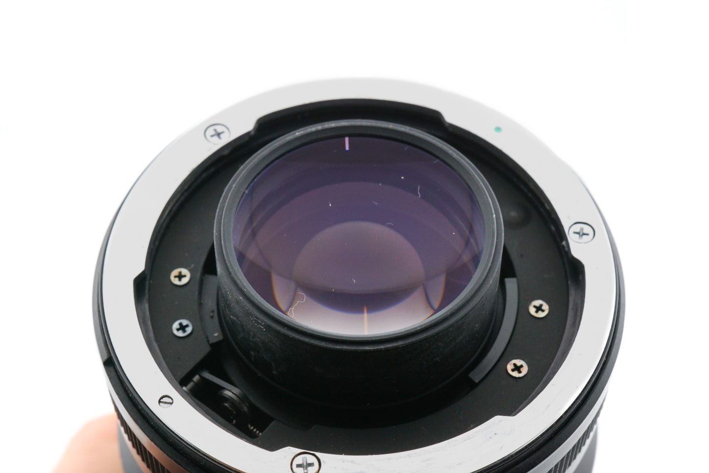 The rear element has a thick layer of haze which may affect the image quality. The zoom is also a bit uneven and the adapter is missing.