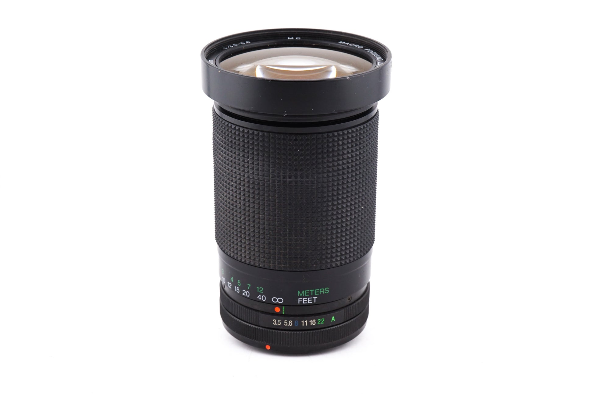Manual focus superzoom lens made for Canon FD mount 35mm SLRs by Vivitar. Push/pull body design. Metal body available in black.