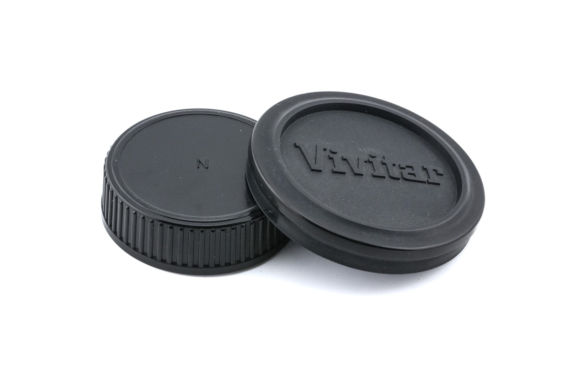 Manual focus normal zoom lens made for Nikon F mount SLR cameras by Vivitar. It has the bunny ear metering prongs and AI ridge but no AI-S tab, so it will meter properly on all manual Nikon cameras but won't work with the advanced metering modes of later cameras. Plastic/metal body available in black.