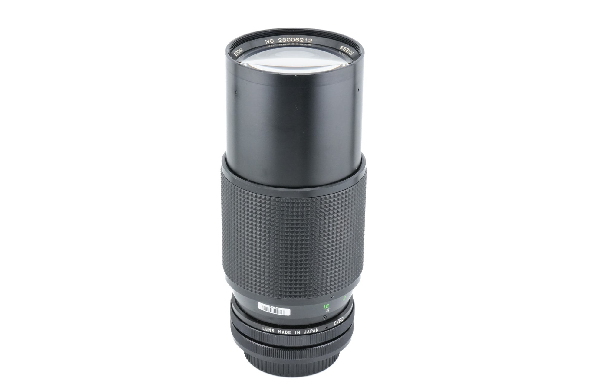 Manual focus telephoto zoom lens made for Canon FD mount 35mm SLRs by Vivitar. It uses a push/pull zoom design. Metal body available in black.