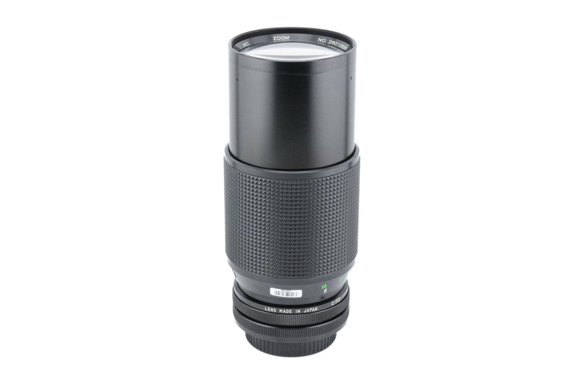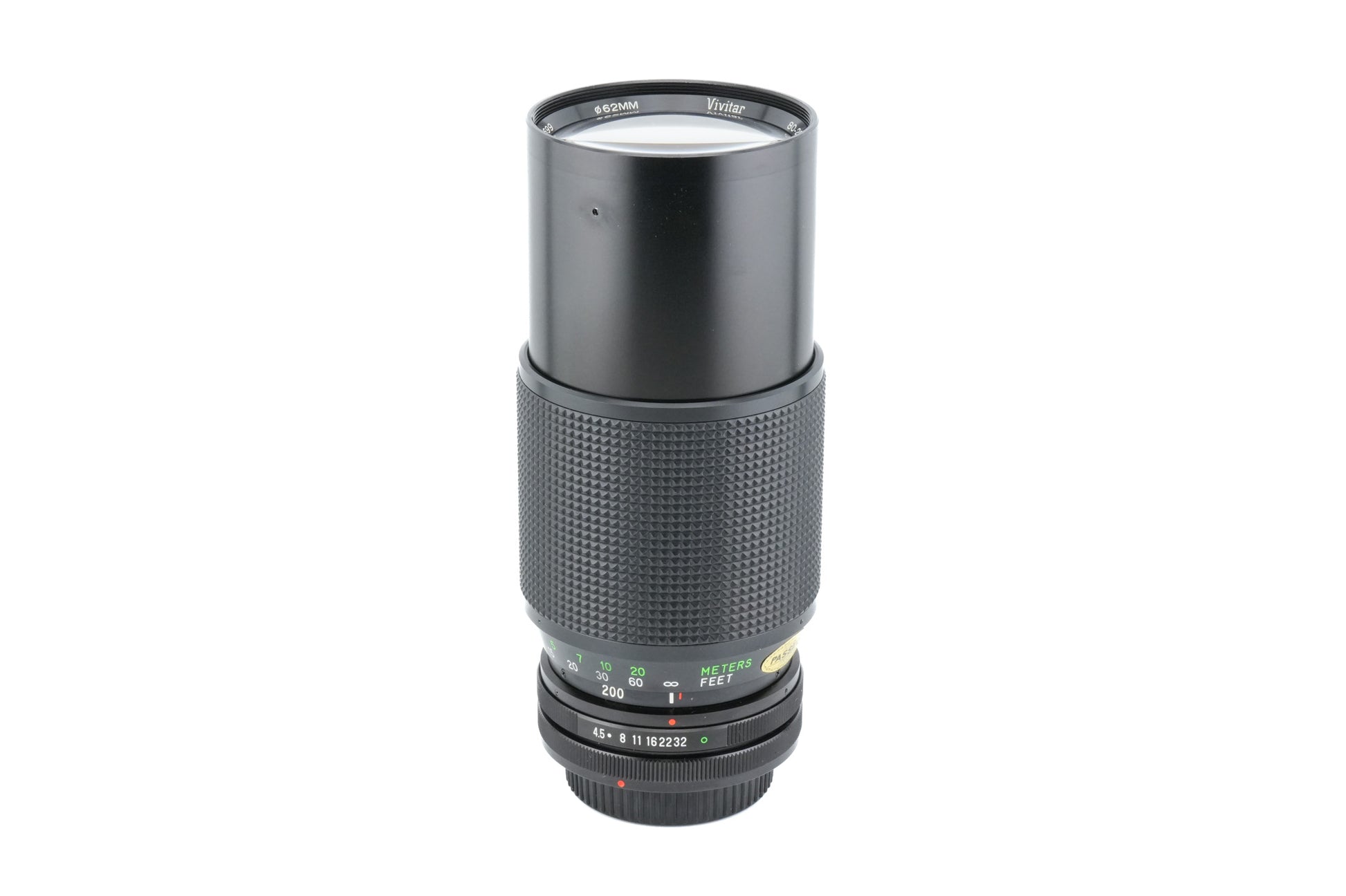 Manual focus telephoto zoom lens made for Canon FD mount 35mm SLRs by Vivitar. It uses a push/pull zoom design. Metal body available in black.