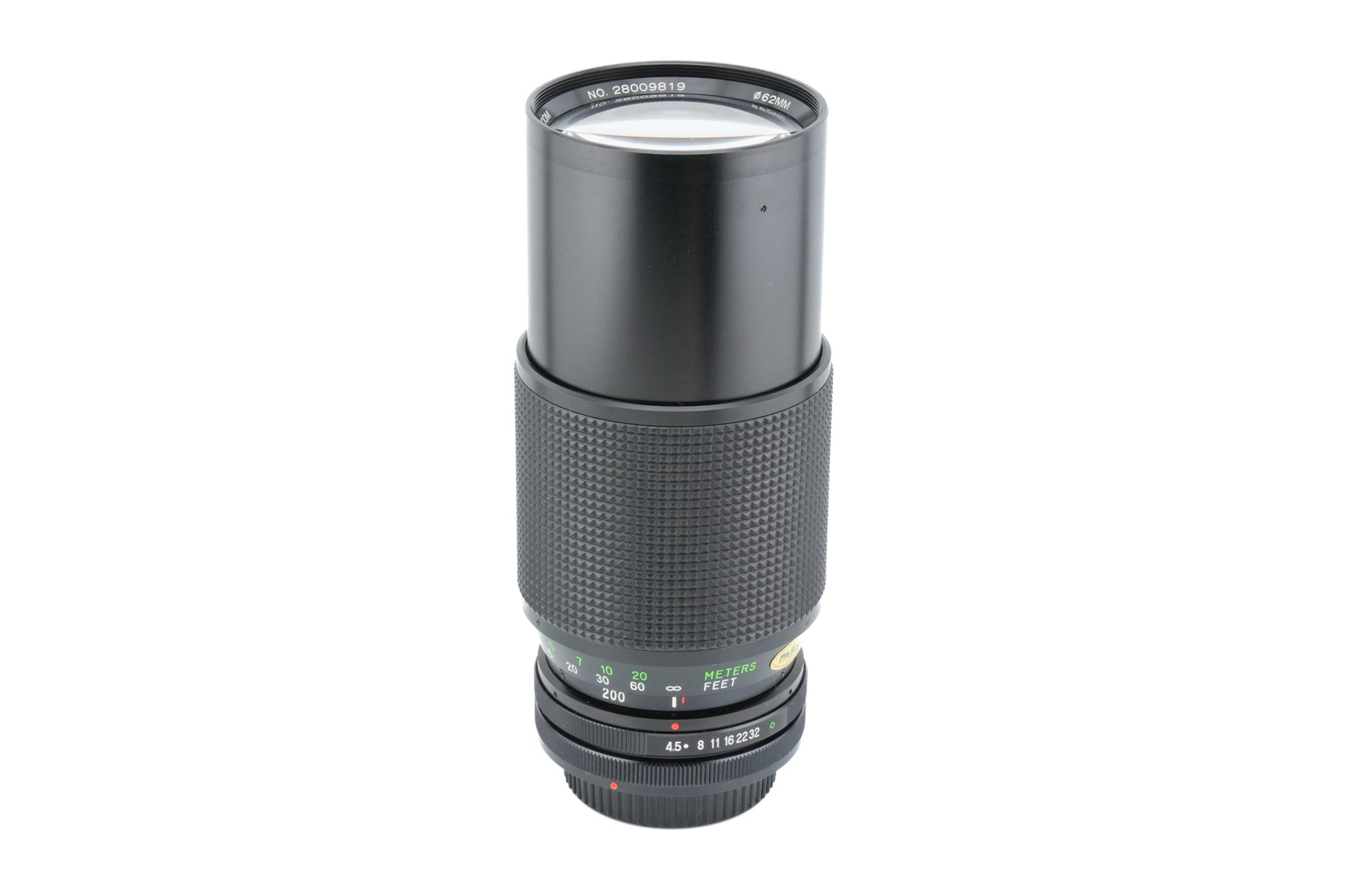 Manual focus telephoto zoom lens made for Canon FD mount 35mm SLRs by Vivitar. It uses a push/pull zoom design. Metal body available in black.