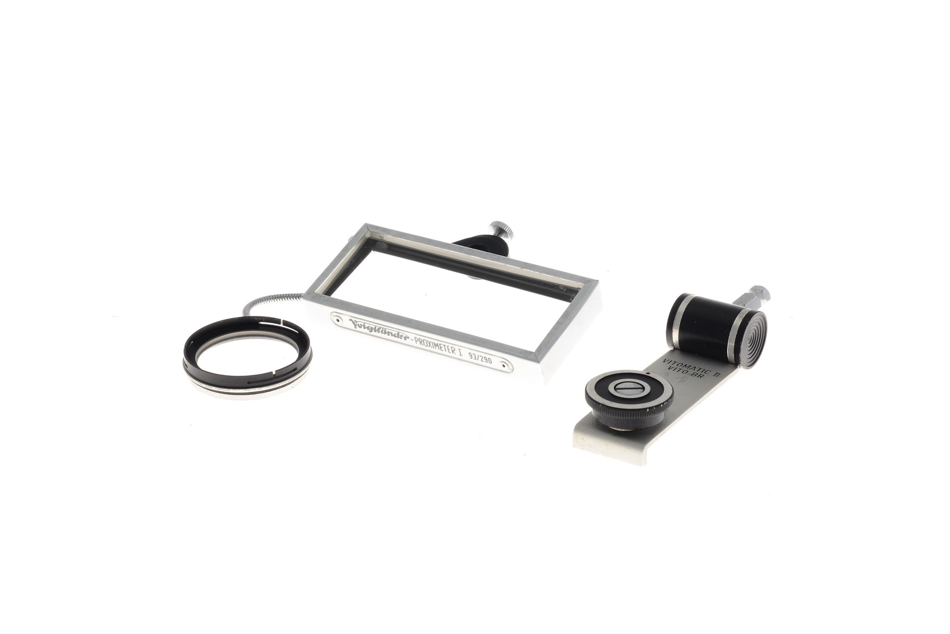 Close-up lens set for Voigtländer Vito series cameras. Consists of two pieces, the hot shoe mount and the viewfinder magnificator attached to the close up lens itself with a metal strap.