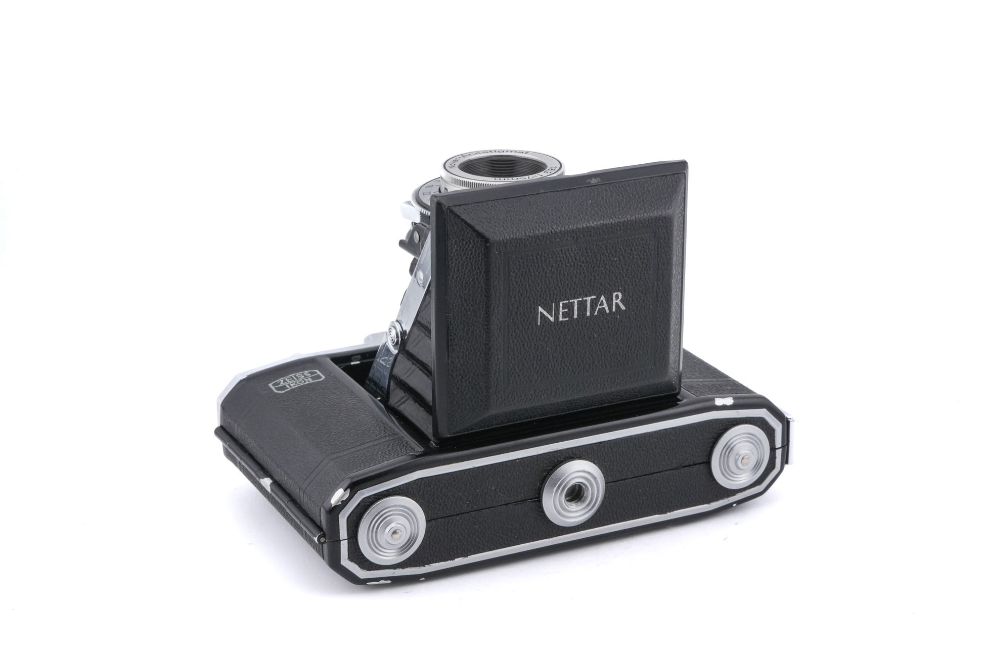 Manual focus 120 folding camera released by Zeiss Ikon in 1949. This was the last model of Nettar, and some even came with double exposure prevention. Many combinations of lens and shutter were available. Metal body available in silver.