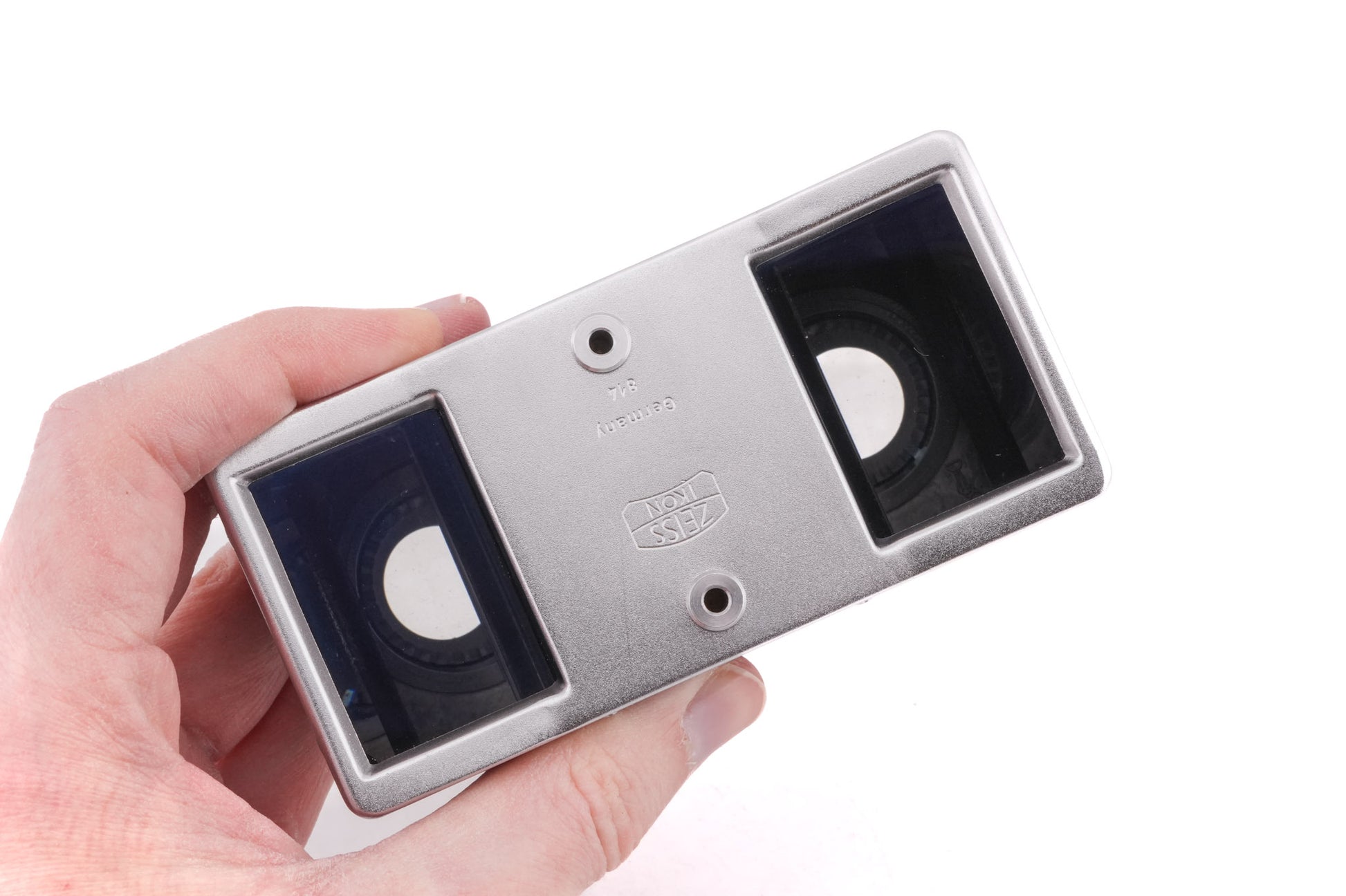 Stereo adapter made for the Contaflex system introduced by Zeiss Ikon. It attaches to the filter threads of the lens. Metal body available in silver.