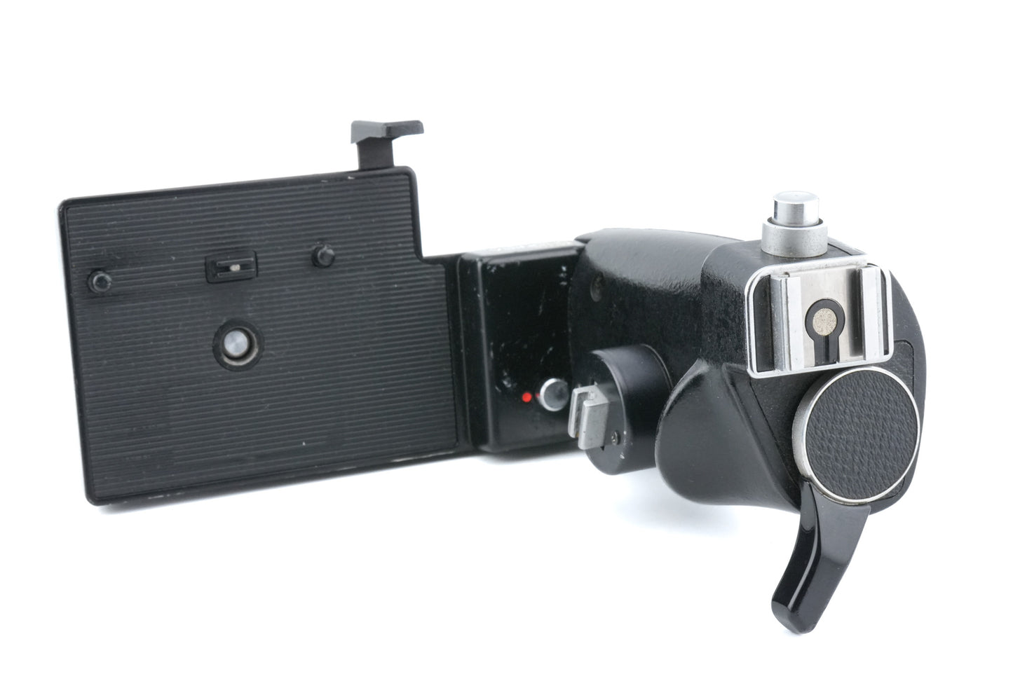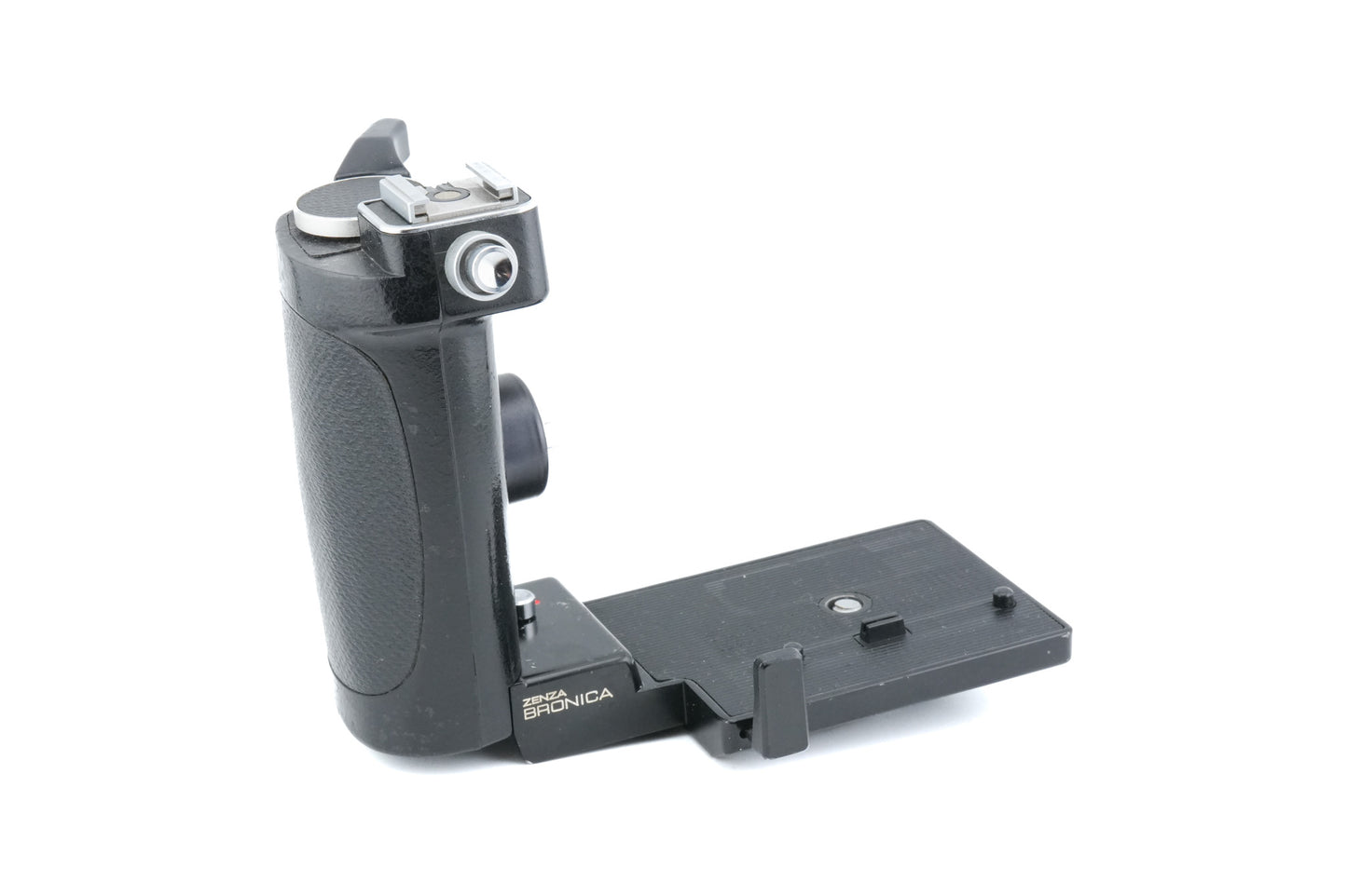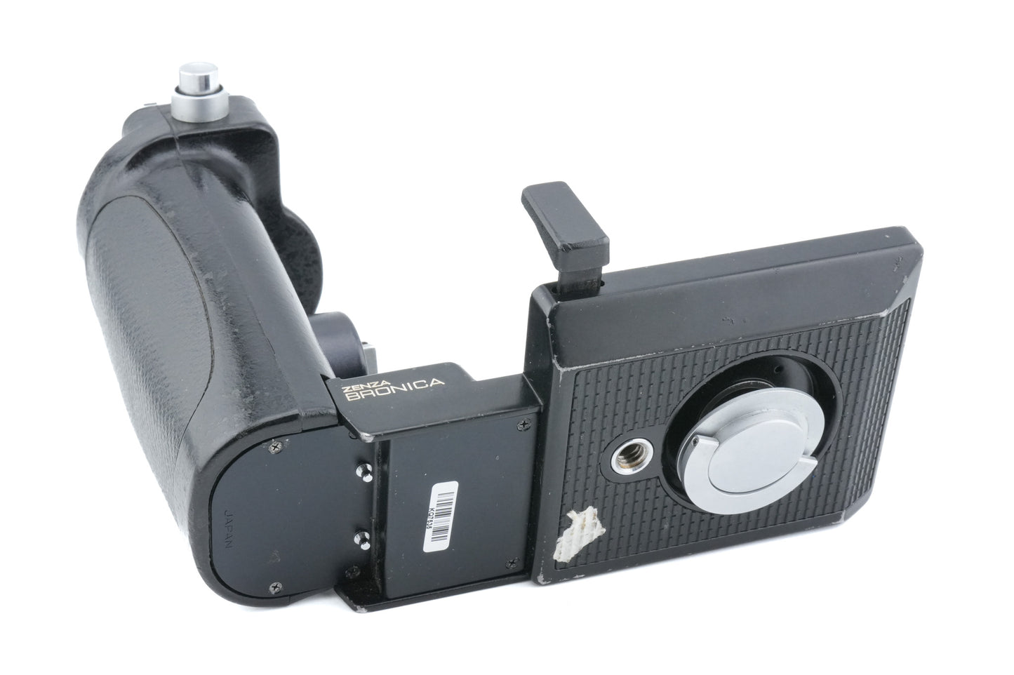 External grip made by Zenza Bronica for the SQ 120 SLR cameras. It is designed to enhance shooting speed and for better handling of the camera. It has thumb winding for film advance. Metal and plastic body available in black.