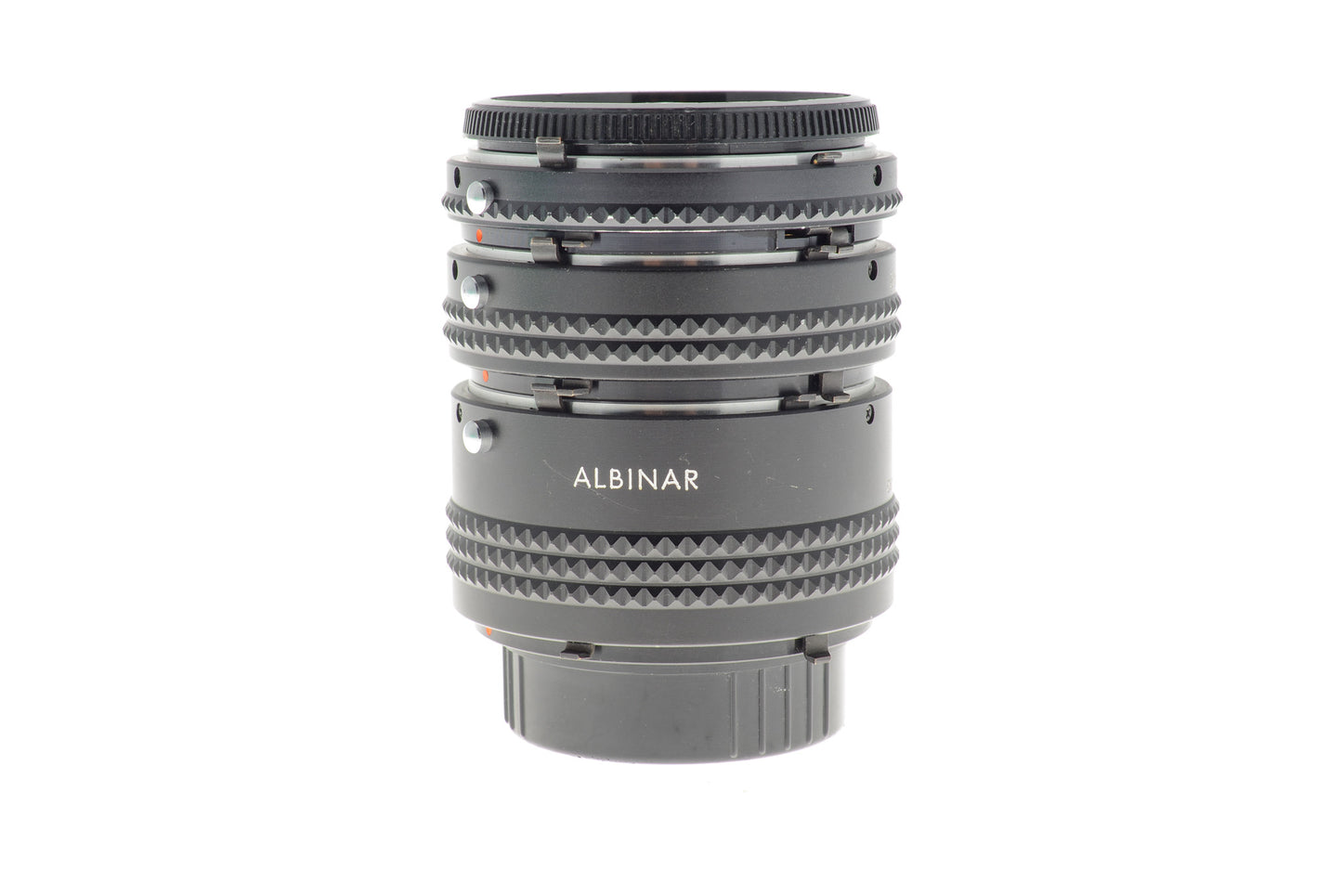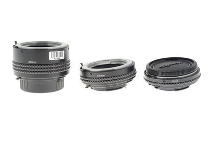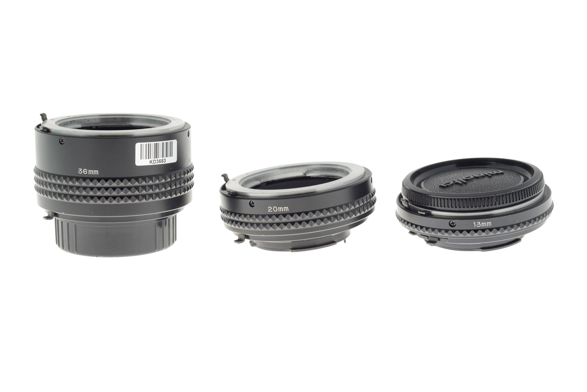 Set of extension tubes for Minolta MD mount 35mm SLRs. Comes with a 13mm, 20mm, and 36mm tube, with an external mechanism for transferring the lens aperture to the body. Metal construction in black finish.