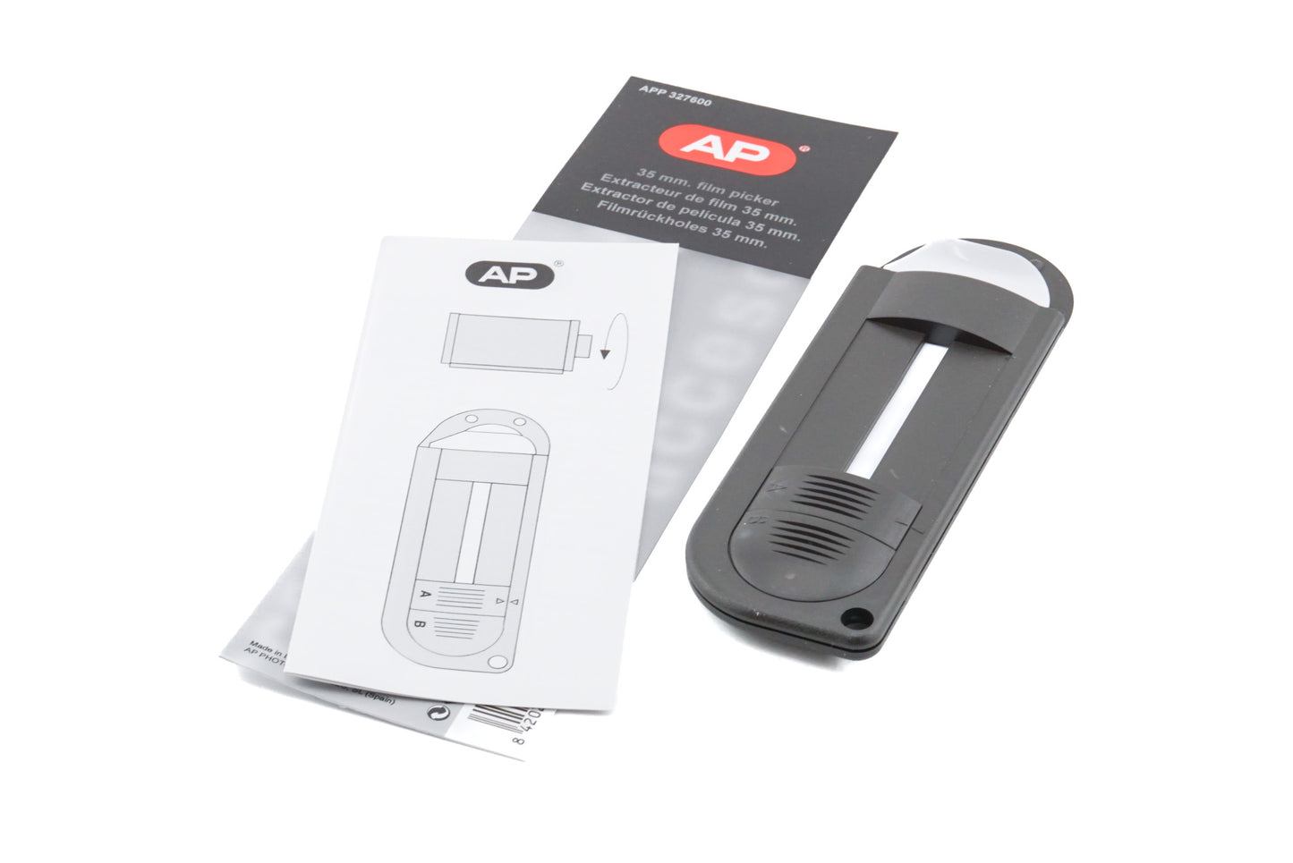 New plastic film picker / retriever for 35mm film canisters. Comes with a manual in a sealed wrapper. Made in the EU out of dark grey plastic.