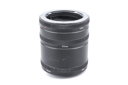 Extension tube set made by Asanuma for use on Olympus OM mount SLRs and lenses, including 12mm, 20mm and 36mm. Black metal body available.
