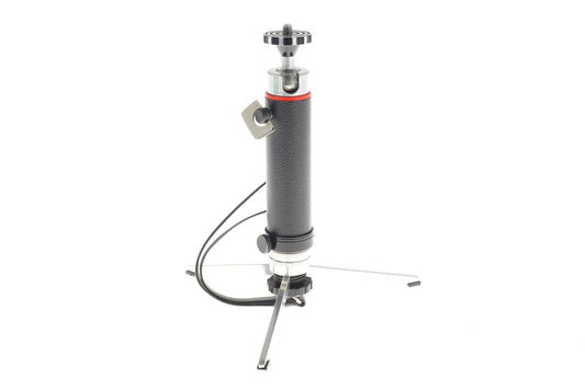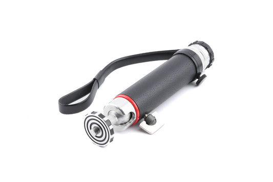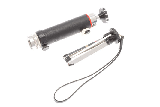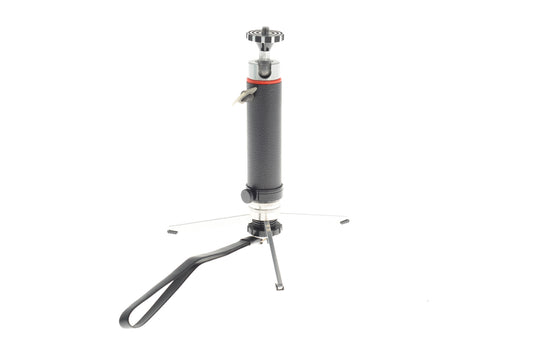Ball head and grip with compact tripod inside. Unscrew the bottom to use the tripod.