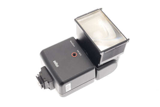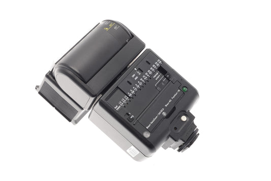 Semi-automatic flash for film cameras. Can be set for f4 or f8 depending on the aperture chosen, and the flash computes the rest using its lightmeter. Comes with different (fixed!) shoe mounts for different systems but also has a universal variant with a single pin SCA 100 mount. The flash head can zoom between 28 and 100mm settings, tilt, and rotate. Plastic construction in black finish.
