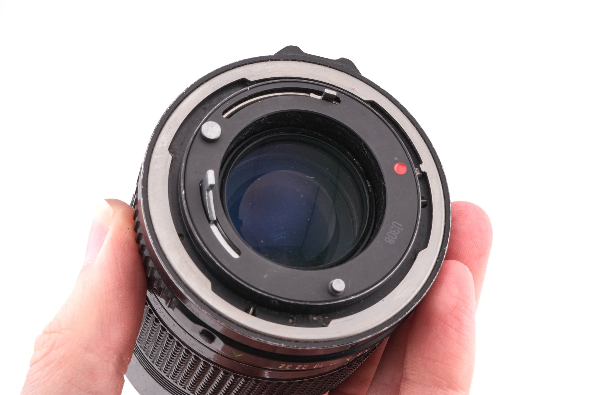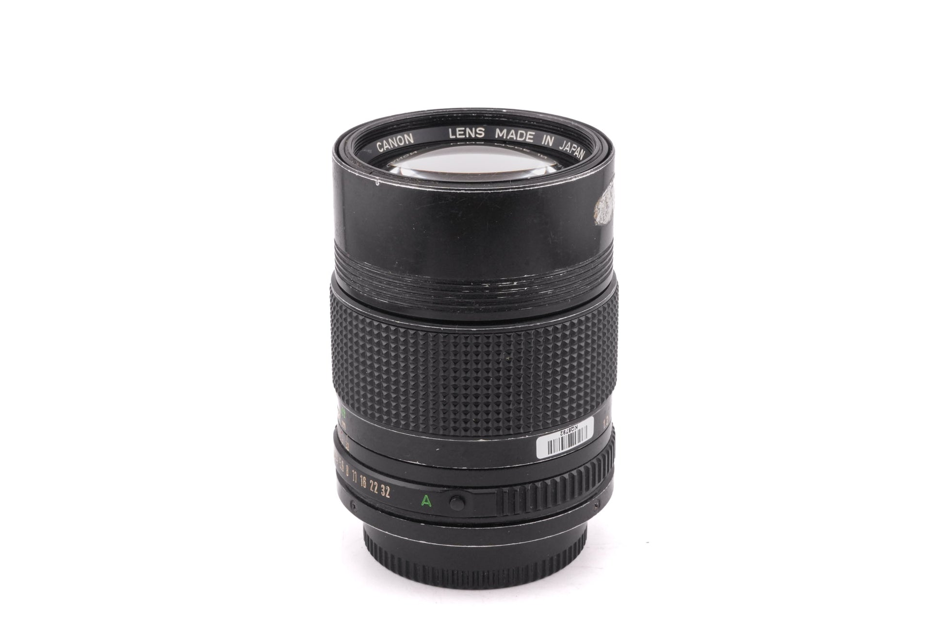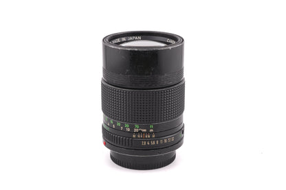 Manual focus telephoto lens made for FD-mount 35mm SLRs by Canon starting in 1979. It uses the newer FDn-style bayonet mounting mechanism and comes with a built-in lens hood. The original price (35,000 Yen) is equivalent to around 350 Euros in 2024. Plastic body available in black.