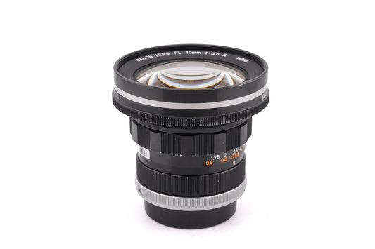 Manual focus super wide-angle lens made for FL-mount 35mm SLR cameras by Canon starting in 1965. It is a retrofocus type with a 96° angle of view and, unlike previous Canon 19mm lenses, did not require the user to lock up the mirror of their SLR. The original price (65000 Yen) is the equivalent of around 1300 Euros in 2025. Metal body available in black.
