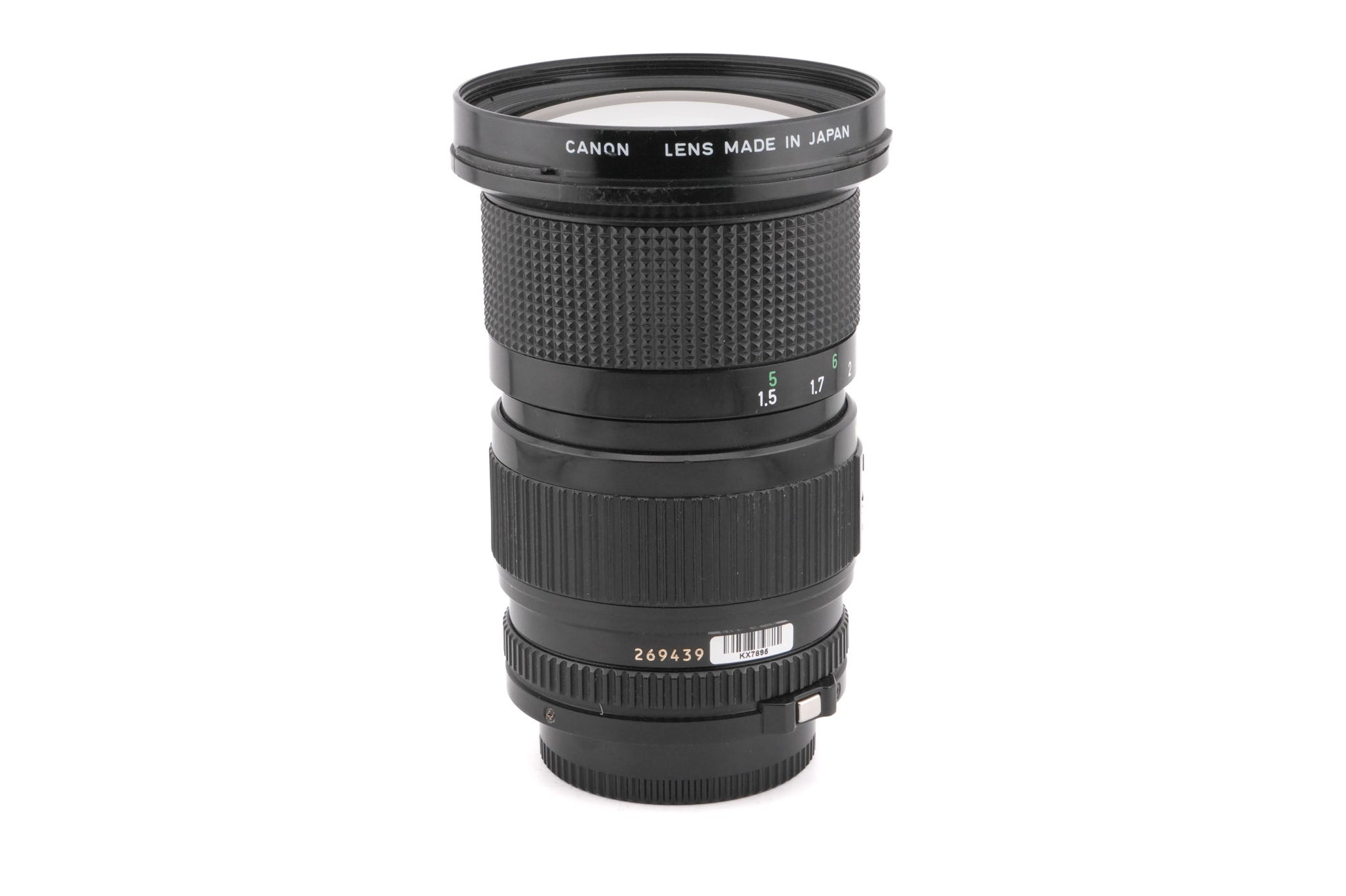 Manual focus normal zoom made for FD-mount 35mm SLR cameras introduced by Canon starting in 1981. The original price (59,000 Yen) is equivalent to ~500 Euros in 2023. Plastic body available in black.