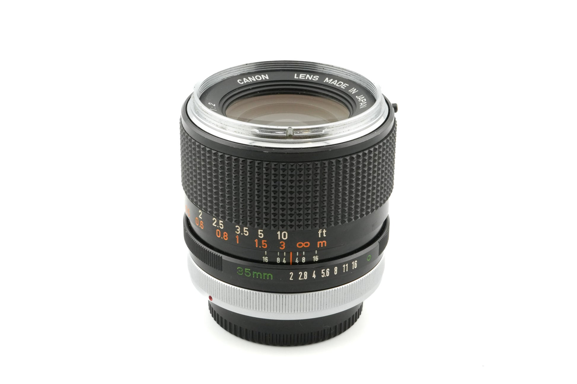 Manual focus wide normal lens made for FD mount 35mm SLRs by Canon starting in 1971. This early model is characterized by its chrome front ring and green circle on the aperture ring whereas newer lenses would have a green "A". This lens also has a concave front element and is referred to by Canon as the 35mm f2 FD (I). Metal body available in black/silver.