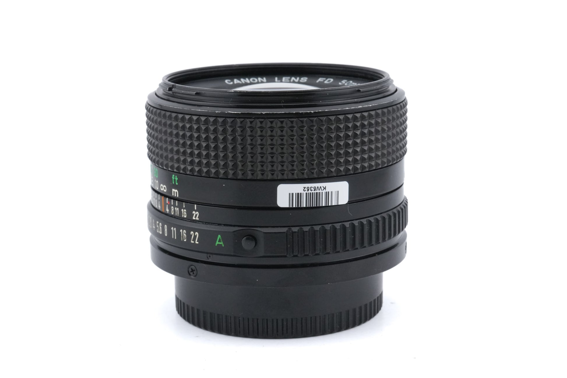 Manual focus normal lens for FD-mount 35mm SLRs by Canon. Intended for low-light photography. Uses Canon's newer locking FDn mount, without the external breech lock and with newer coatings. Metal/plastic body available in black.
