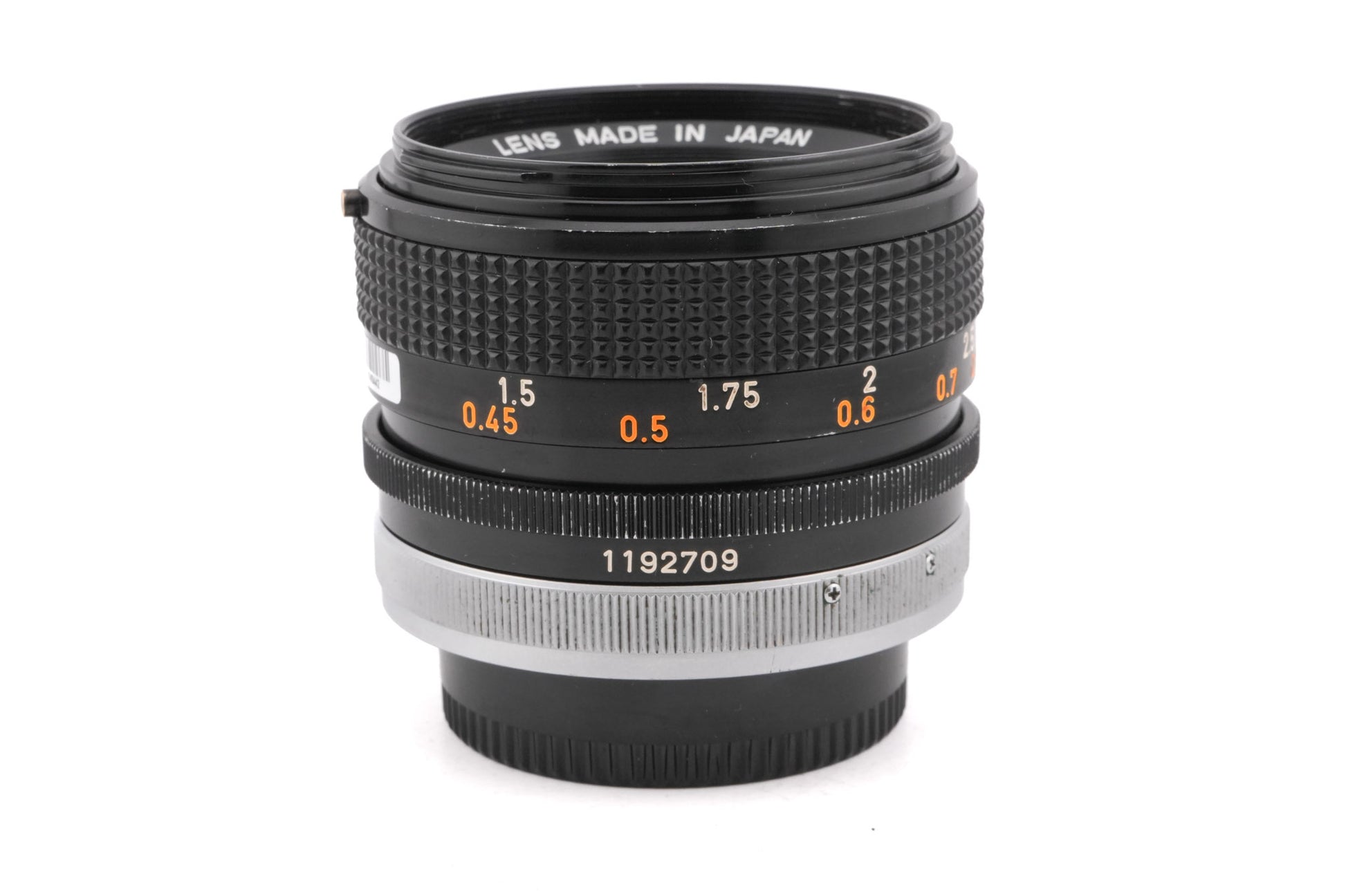 Manual focus normal lens made for FD-mount SLRs in 1973 by Canon. It uses the older breech-lock style mounting mechanism and has Canon's Super Spectra (SSC) multicoating. The original price (25,500 Yen) is the equivalent of around 425 Euros in 2023. Metal body available in black.