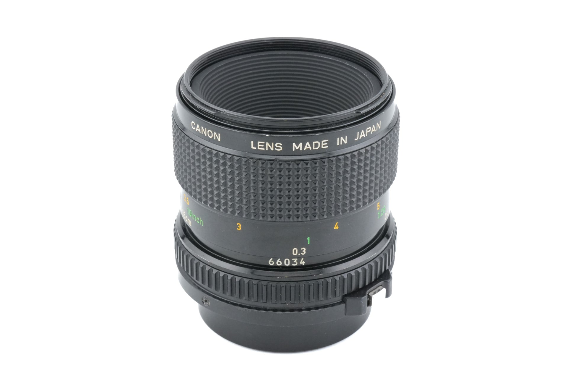 Manual focus macro lens made for FD-mount 35mm SLR cameras introduced by Canon. It uses the newer FDn mounting mechanism. Metal body available in black.