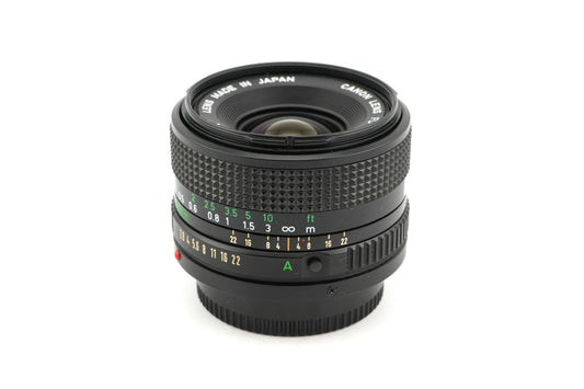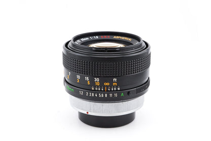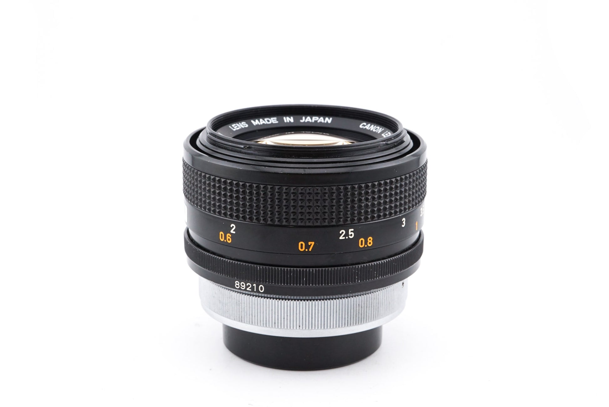 Manual focus normal lens made for FD-mount 35mm SLR cameras introduced by Canon starting in 1975. The optical structure has one aspherical lens element and uses a floating element system. The original price (80000 Yen) is the equivalent of around 1025 Euros in 2025. Metal body available in black.