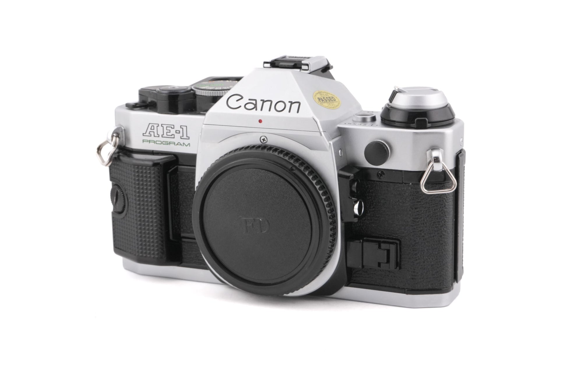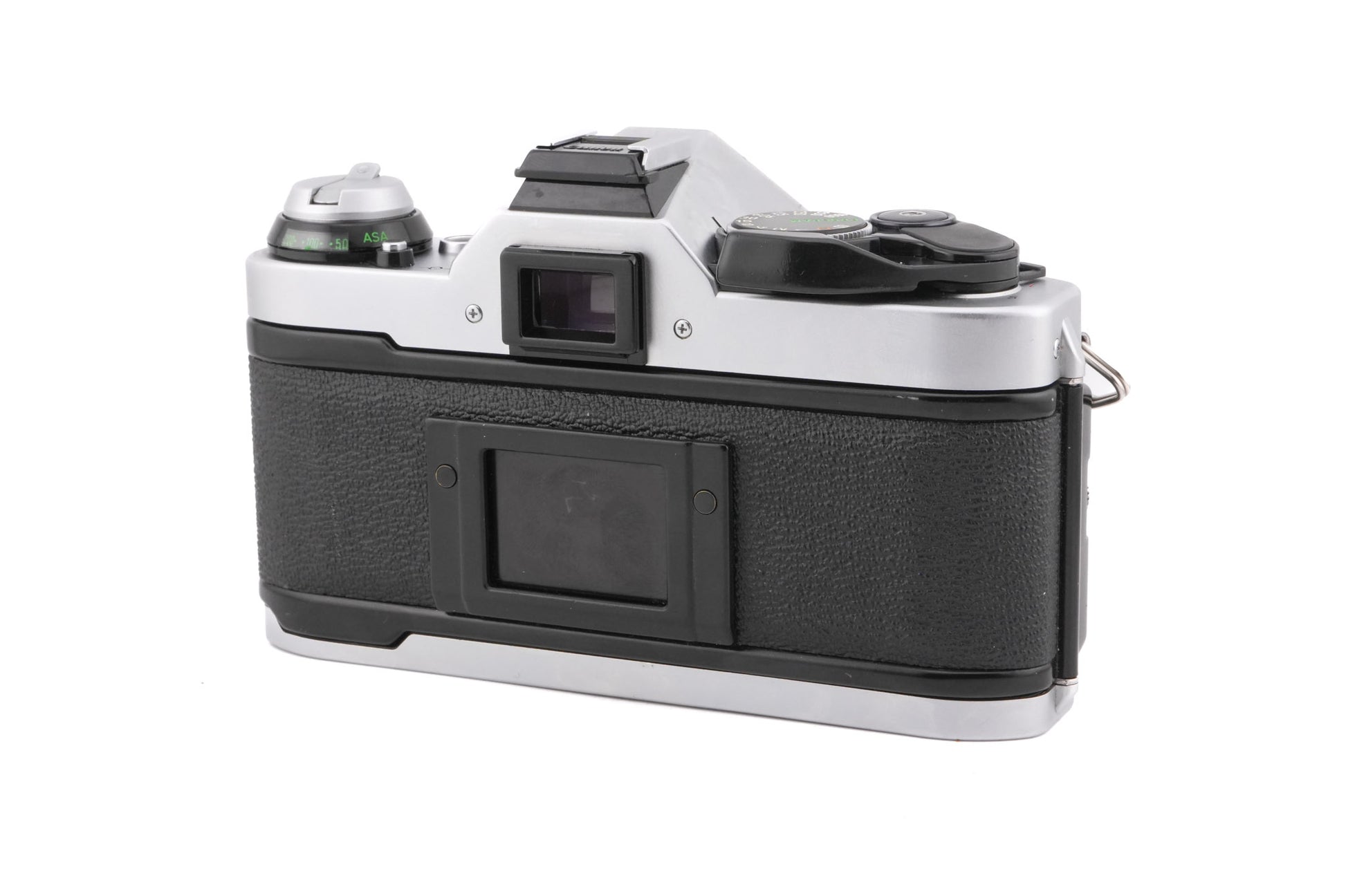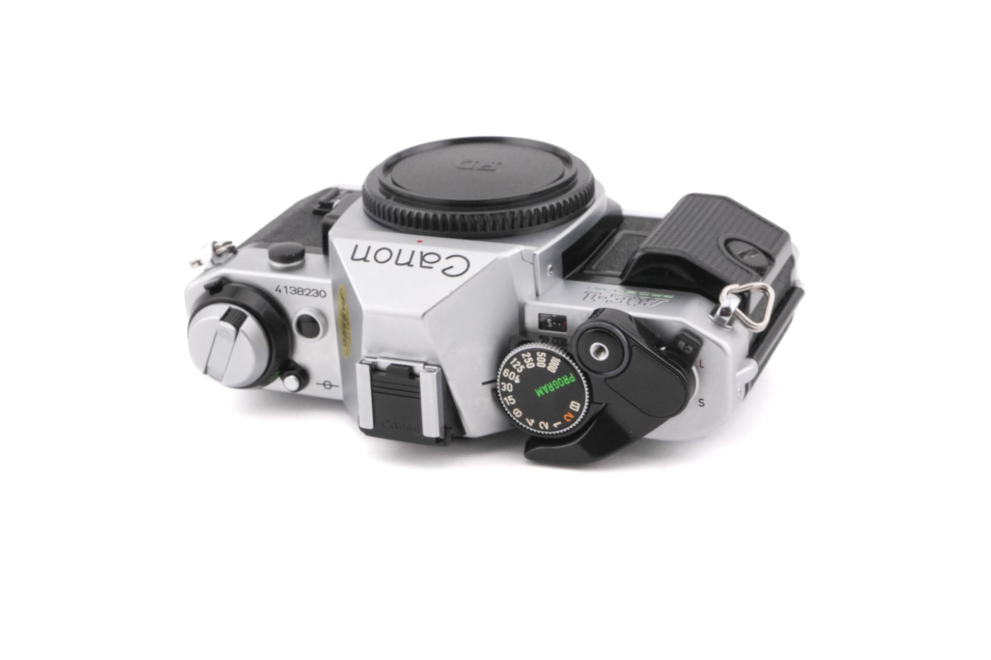 Manual focus FD-mount 35mm SLR released by Canon in 1981. The camera’s main advantage over the AE-1 is access to full program mode. In this mode, the camera will set both aperture and shutter speed automatically based on the lighting condition. The original price (60,000 Yen) is the equivalent of around 525 Euros in 2023. Metal body available in black & silver.