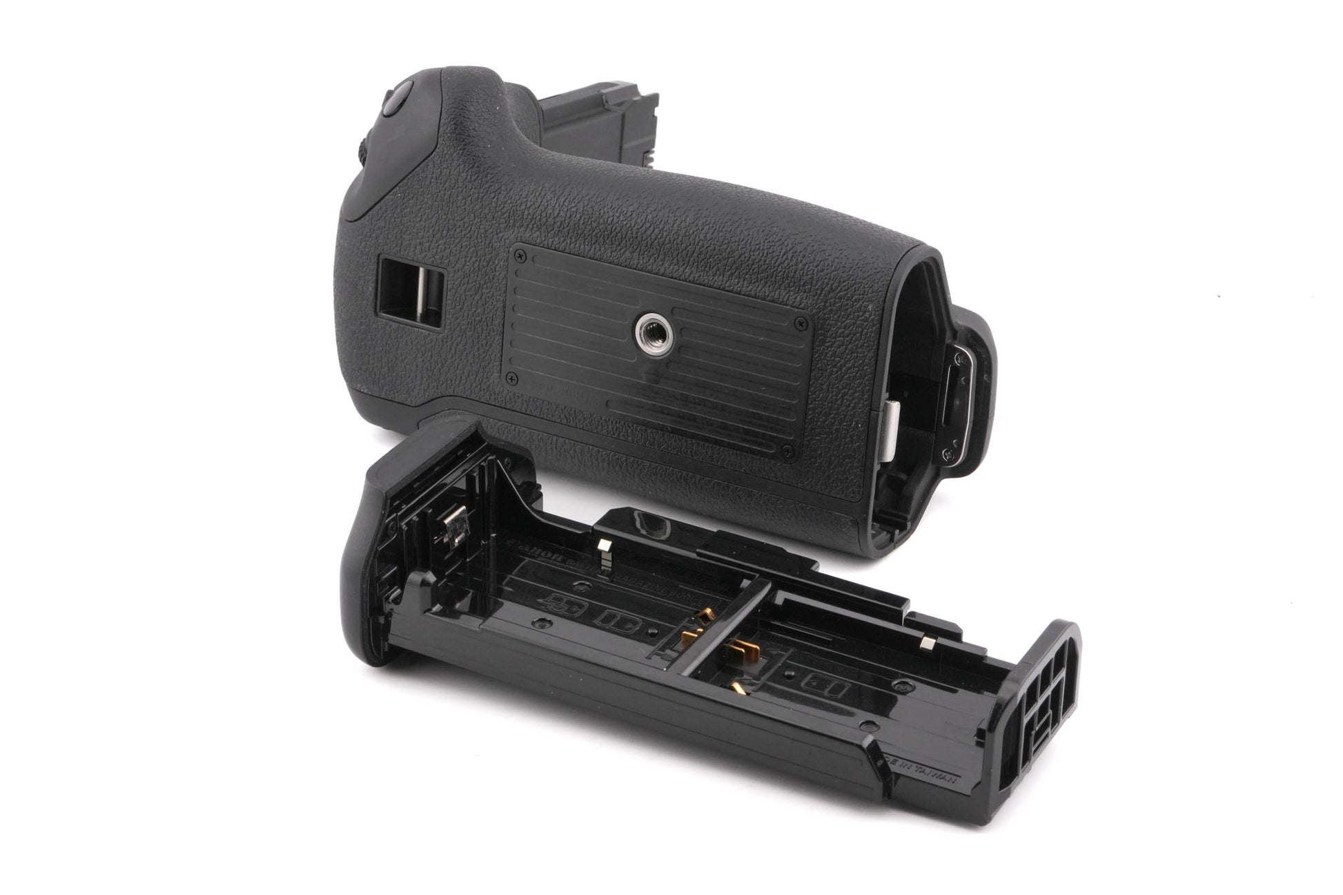 Battery grip made for Canon EOS 7D Mark II DSLR camera by Canon. It has a shutter release button, main dial, multi-controller, AF point selection button, AE/FE lock button, AF start button, and multi-function button. Plastic body available in black.