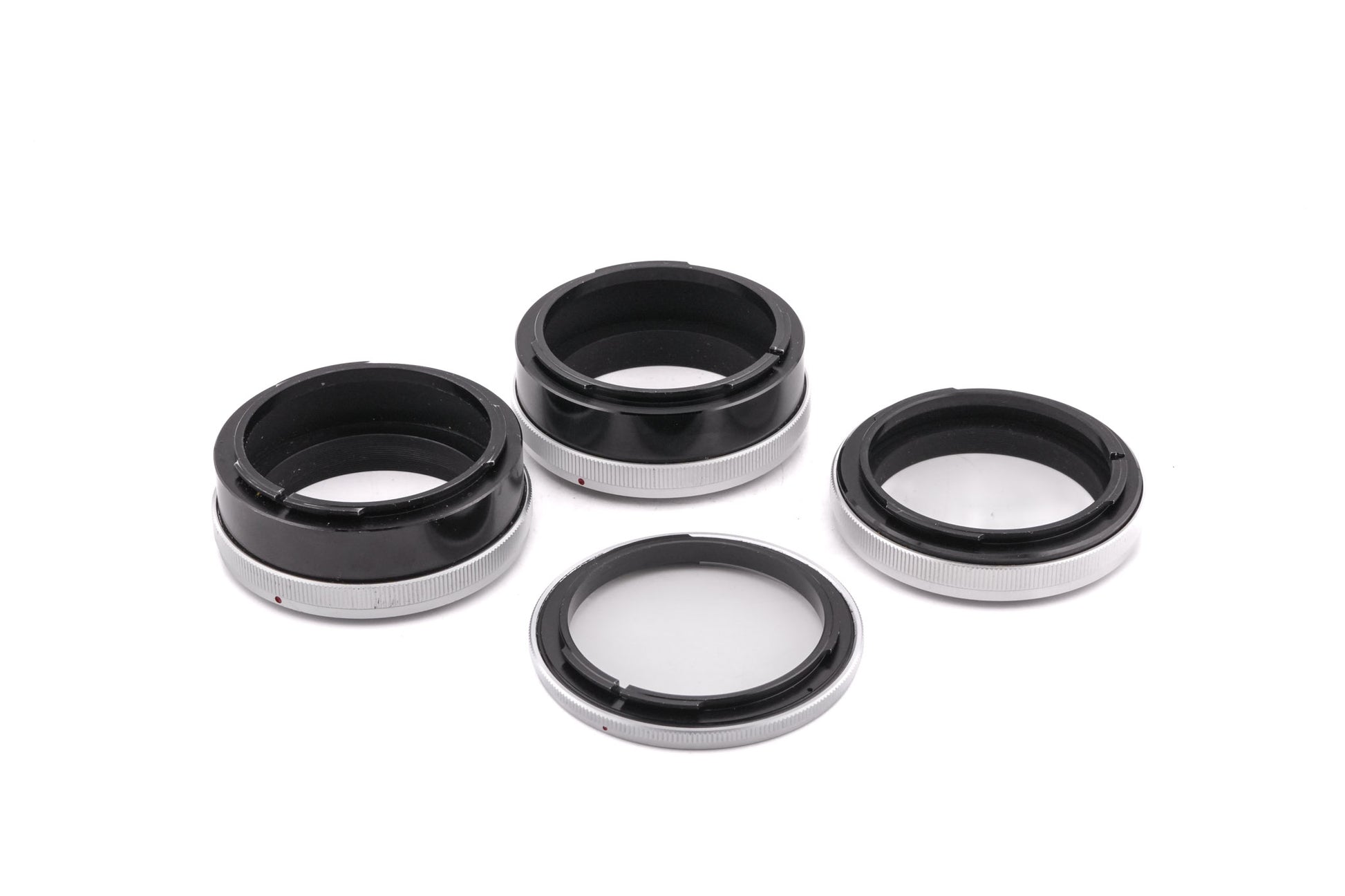 Set of extension tubes made by Canon for their FL & FD mount 35mm SLRs. These tubes allow for closer focusing at the cost of automatic aperture control. The set includes one M5, one M10, and two M20 tubes. Metal body available in black/silver.