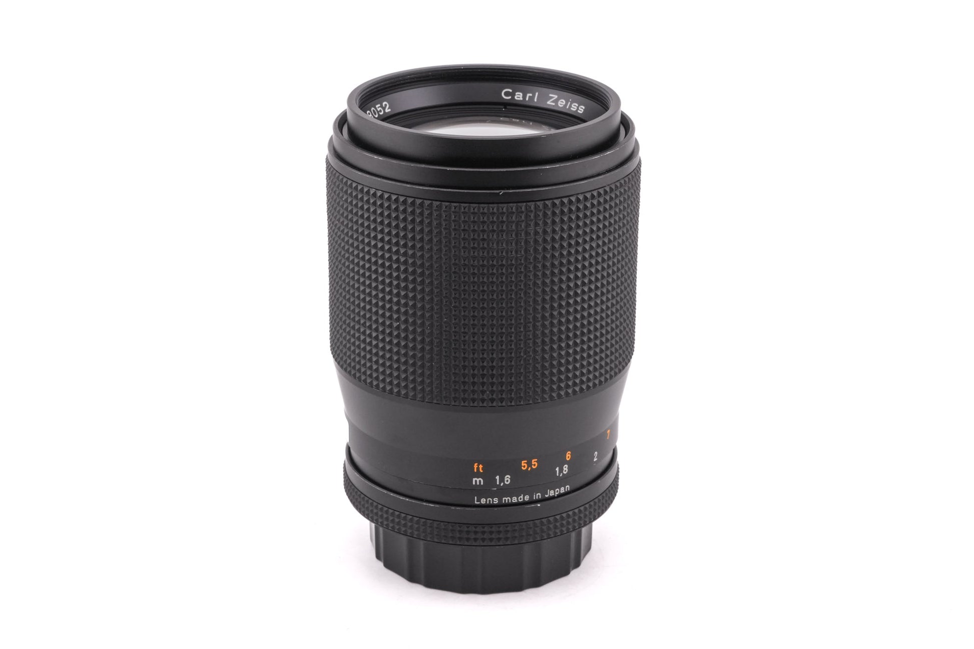 Manual focus telephoto lens made for Contax/Yashica mount 35mm SLR cameras introduced by Carl Zeiss in 1974. This lens is of the older AE variant with “ninja star” bokeh and no support for shutter priority or program modes. It has a built-in lens hood. Metal body available in black.