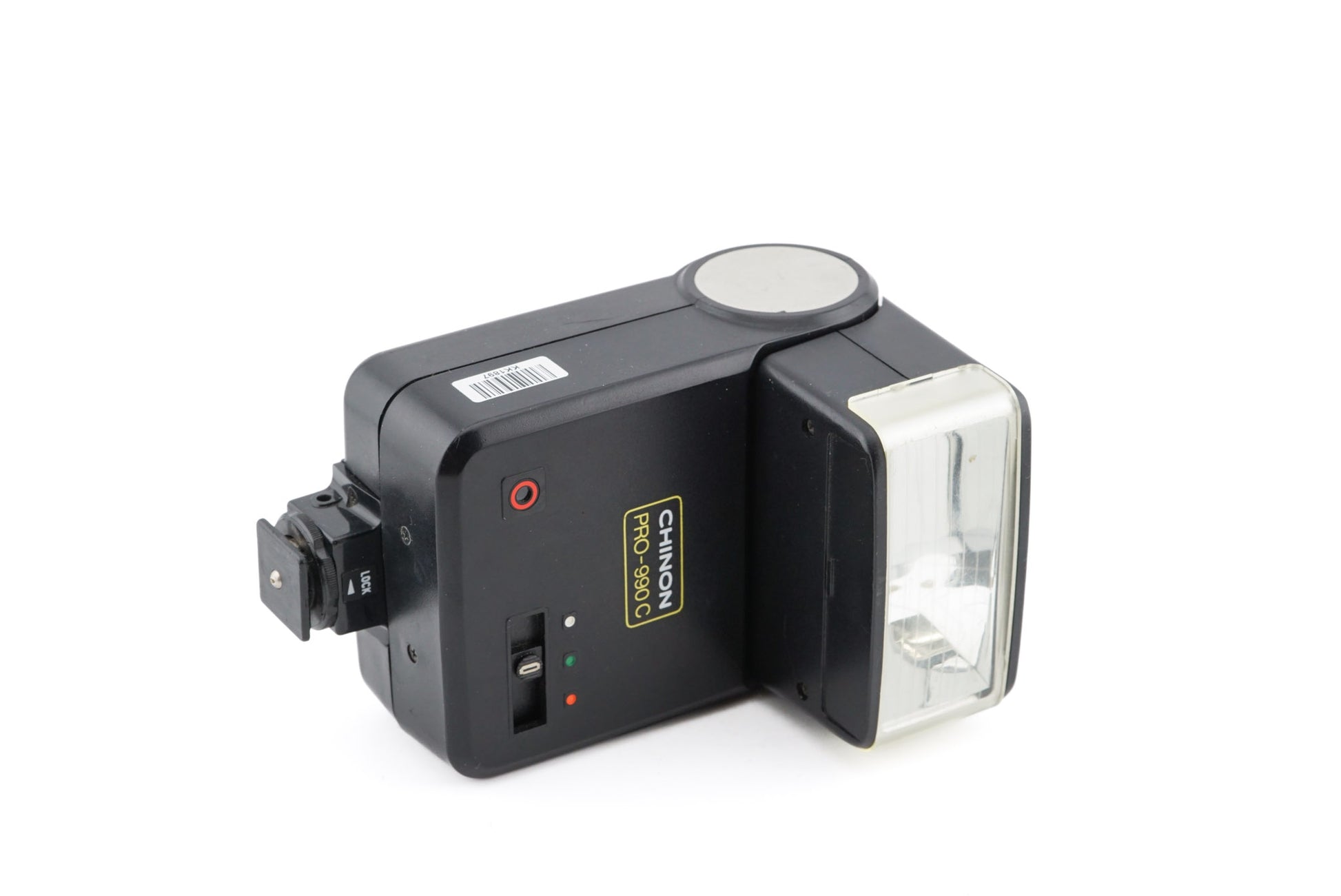 Flash made by Chinon. Has a single contact for manual exposure and a PC sync port. Has 3 flash strengths and a 90º tilting head. Plastic construction in black finish.