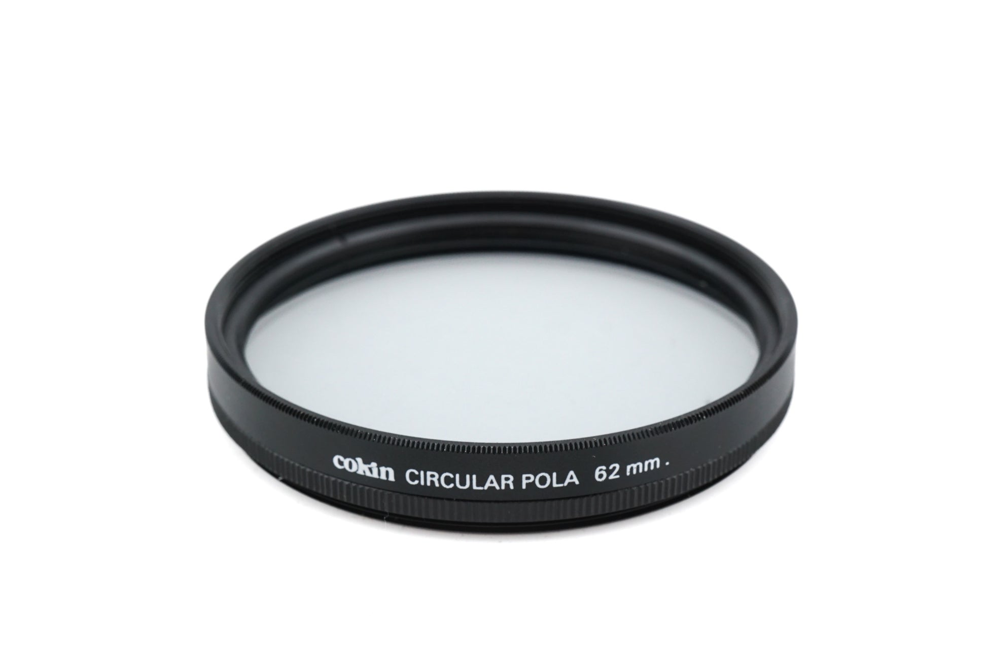 Circular polarizing filter from Cokin, for lenses with 62mm filters. Able to rotate to counteract glare from any angle. Black metal construction, with knurled sides and edges.