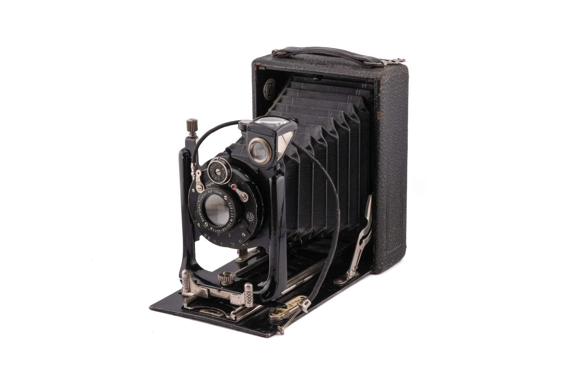 Manual focus 6x9 folding plate camera introduced by Contessa-Nettel. Metal body available in black.