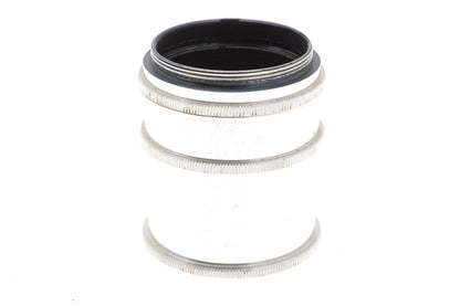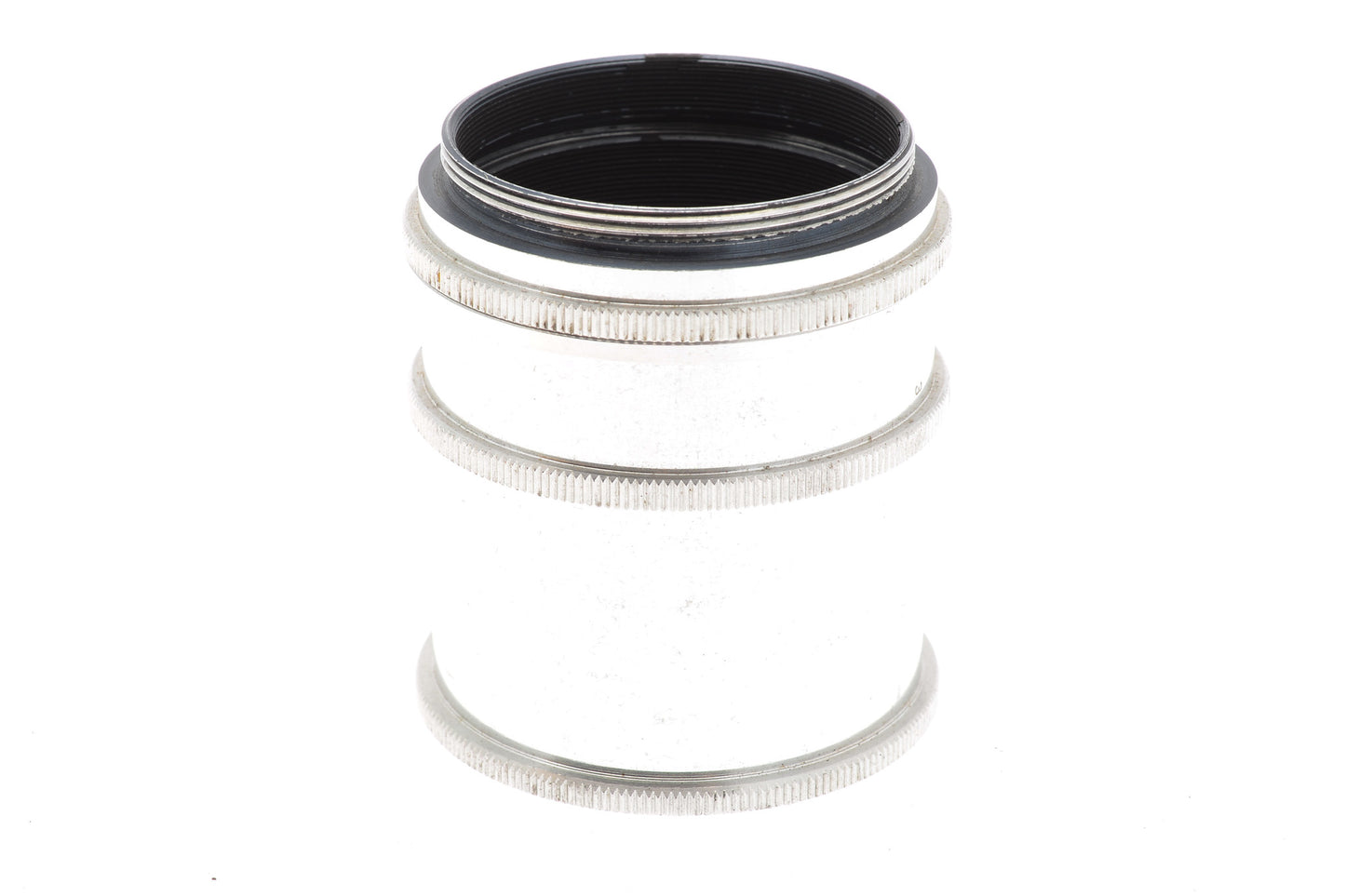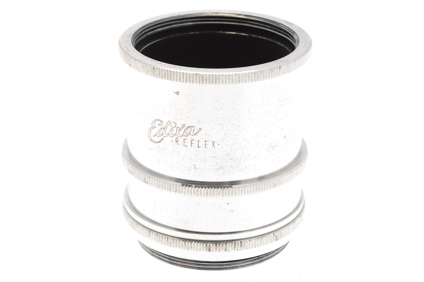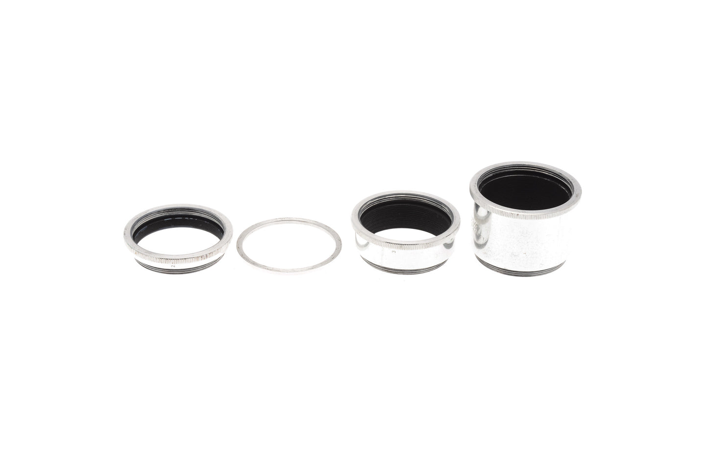 Set of four extension tubes for M42 screw mount lenses and cameras made by Edixa. The extension provided by tube no. 1 is 2mm, 6mm by tube no. 2, 13.5mm by tube no. 3, and 29.5mm by tube no. 4. Note that tube no. 1 is just a spacer with no threads. Metal construction in silver grey.