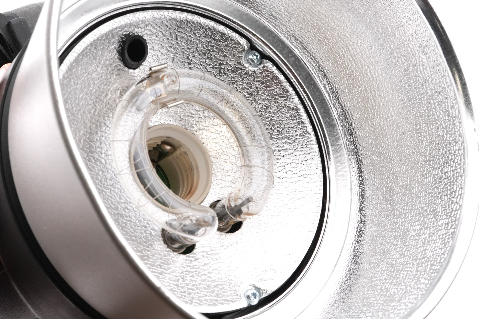 Studio flash made by Elinchrome. Plastic construction available in black.