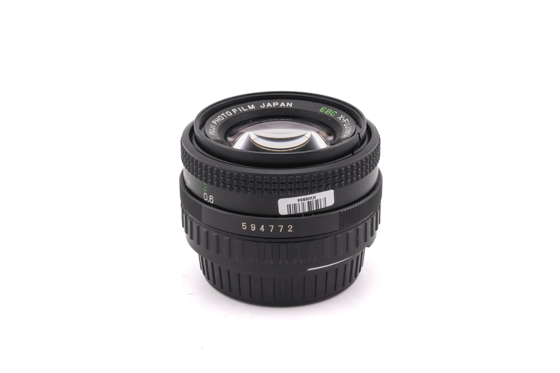Manual focus normal lens made for Fujica X-mount 35mm SLR cameras introduced by Fuji in 1979. It will not mount on modern Fujifilm X-mount digital cameras. Metal body available in black.